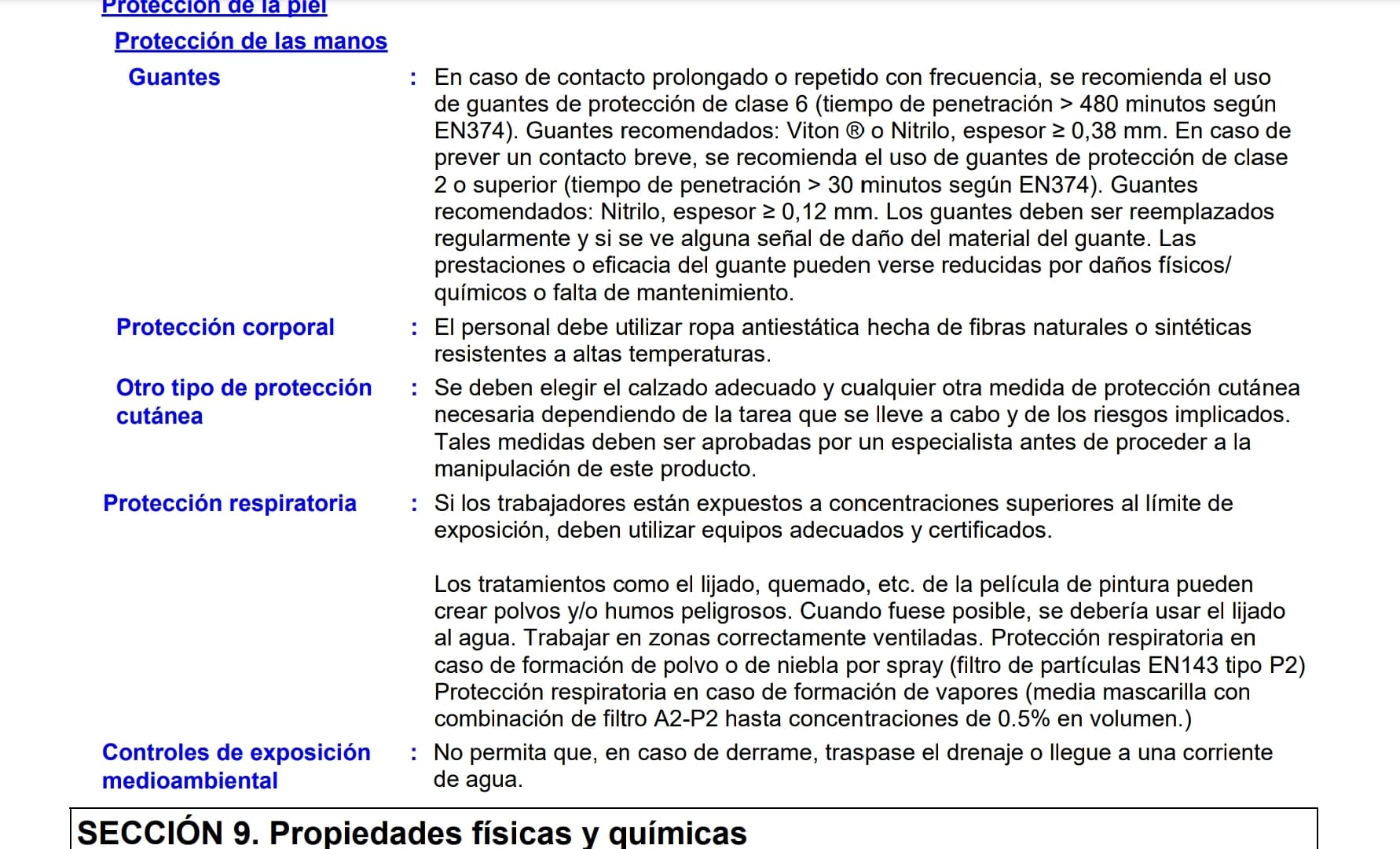 En el punto 8, correspondiente al control de exposición y protección individual, nos indican qué tipo de protecciones son necesarias para protegernos del producto según la exposición.