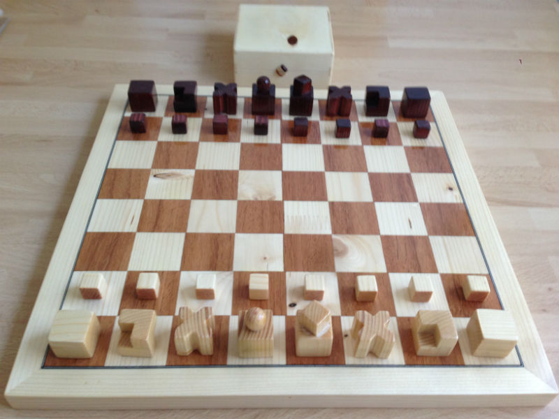 Les muestro el resultado de mi último proyecto. Es un ajedrez Bauhaus, llamado así porque fue diseñado por el escultor Josef Hartwig en el año 1924, quien fue profesor en esta afamada escuela de diseño alemana.