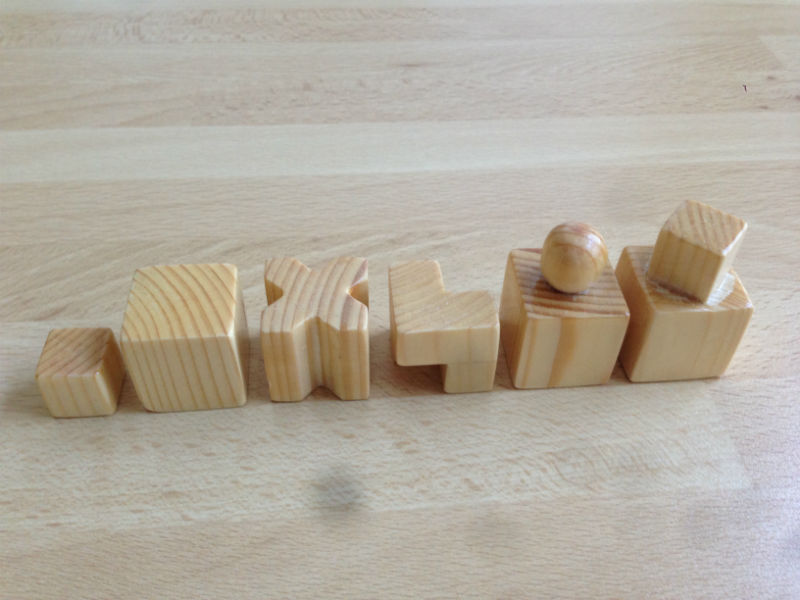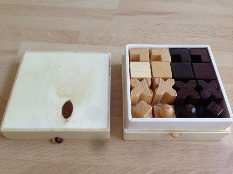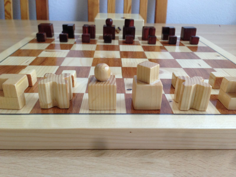 En este ajedrez, las piezas se representan de acuerdo a la función que desempeñan en el juego, de manera que la forma de cada una de ellas enfatiza el movimiento que le es propio. Así, los alfiles tienen forma de X; los caballos, de L; las torres y los peones son cubos; el rey, una combinación de dos cubos; y la reina, un cubo y una esfera.