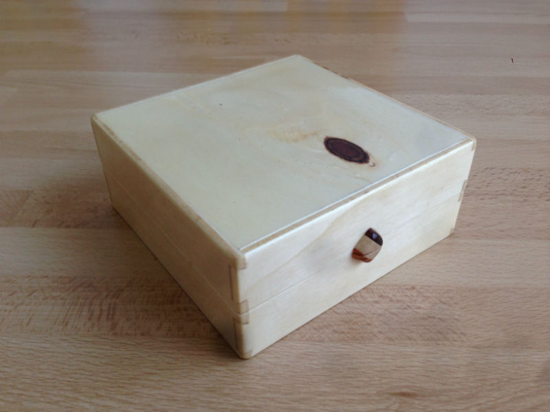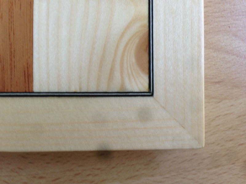 Así como Beethoven vivió la transformación del clasicismo al romanticismo, así también este ajedrez vivió mi transformación del uso de herramientas eléctricas al uso exclusivo de herramientas manuales, por lo que en su construccion se han usado un coktel de metodos y materiales muy ecléctico. El tablero está hecho con madera reciclada: pino de una construcción para los cuadros blancos y una madera oscura que no se lo que es pues formaba parte de unas ventanas (por su apariencia diría que es algún tipo de Meliaceae, pero no estoy seguro). Las piezas son todas de pino, natural para las blancas y teñido para las negras. La cajita para las piezas es de contrachapado de chopo puro y duro. El tablero y la cajita están acabados con gomalaca a muñequilla; las piezas con laca de spray.