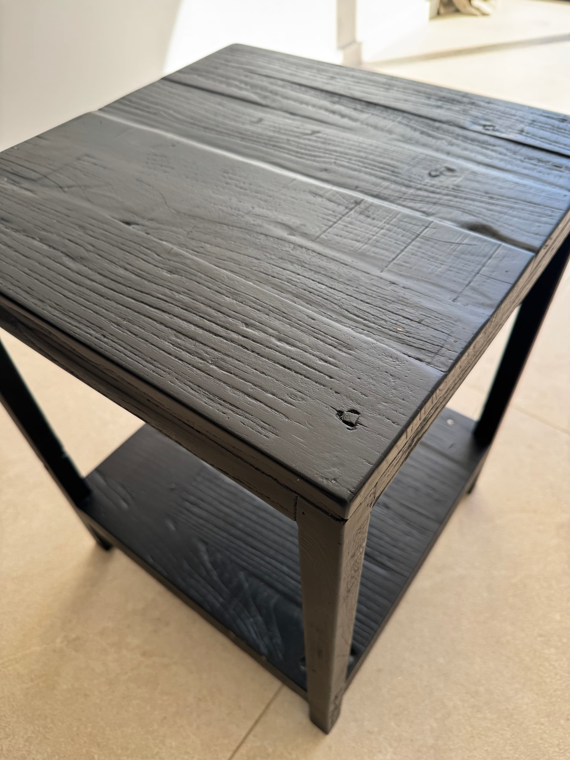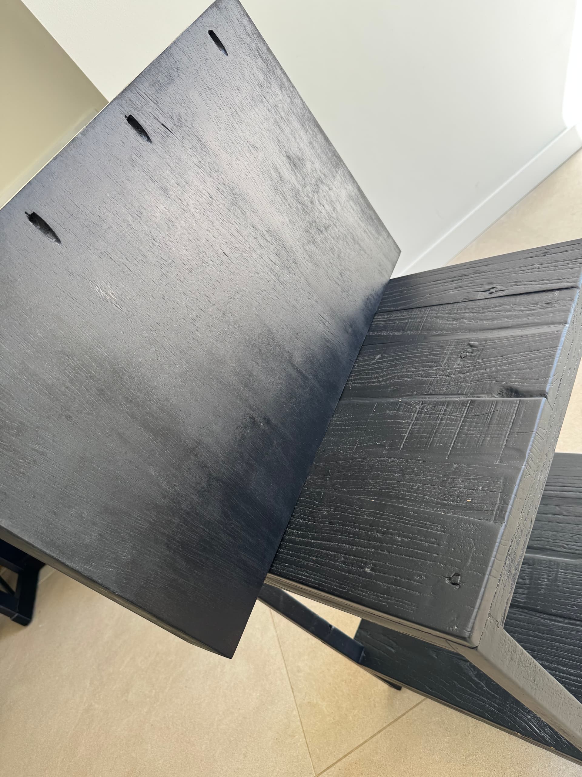 Fui a una tienda especializada en pinturas y me dieron lasur satinado negro. Luego de dar dos capas con lijado entre medias, el resultado no me está gustando ya que no se parece al efecto que le quería dar yo. Solamente he hecho las patas de momento, ya que dejo la parte superior para el final.