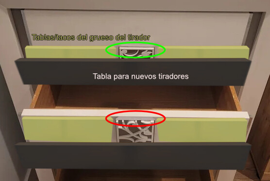 Hola buenos días a todos soy nueva por aquí.Tengo una duda a ver si alguien amablemente me podría orientar.Tengo unas mesillas de estilo moderno que me gustaría darle un estilo más clásico cambiando los tiradores y quizás poniéndole unas patitas,el caso es que los tiradores que lleva son como una madera de sobresale del mueble y no llevan ningún tornillo que los sujete por la cara interna.He intentado estirar para ver si se levantaba un poco pero van super agarrados no se si van pegados con algun pegamento muy fuerte o si llevan clavos internos,os pregunto porqué me da miedo tirar fuerte y que cargarme todo el lacado del mueble de esa zona aunque igual al final es la unica forma de averiguar como va agarrado eso.