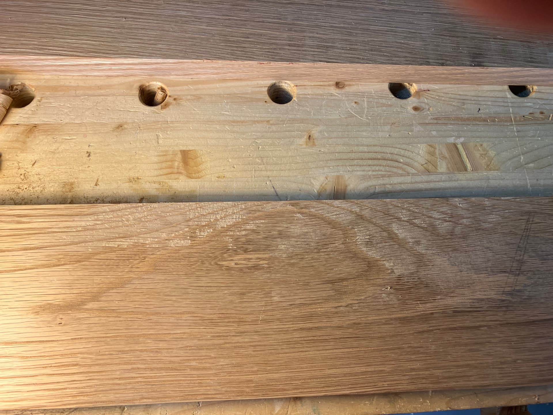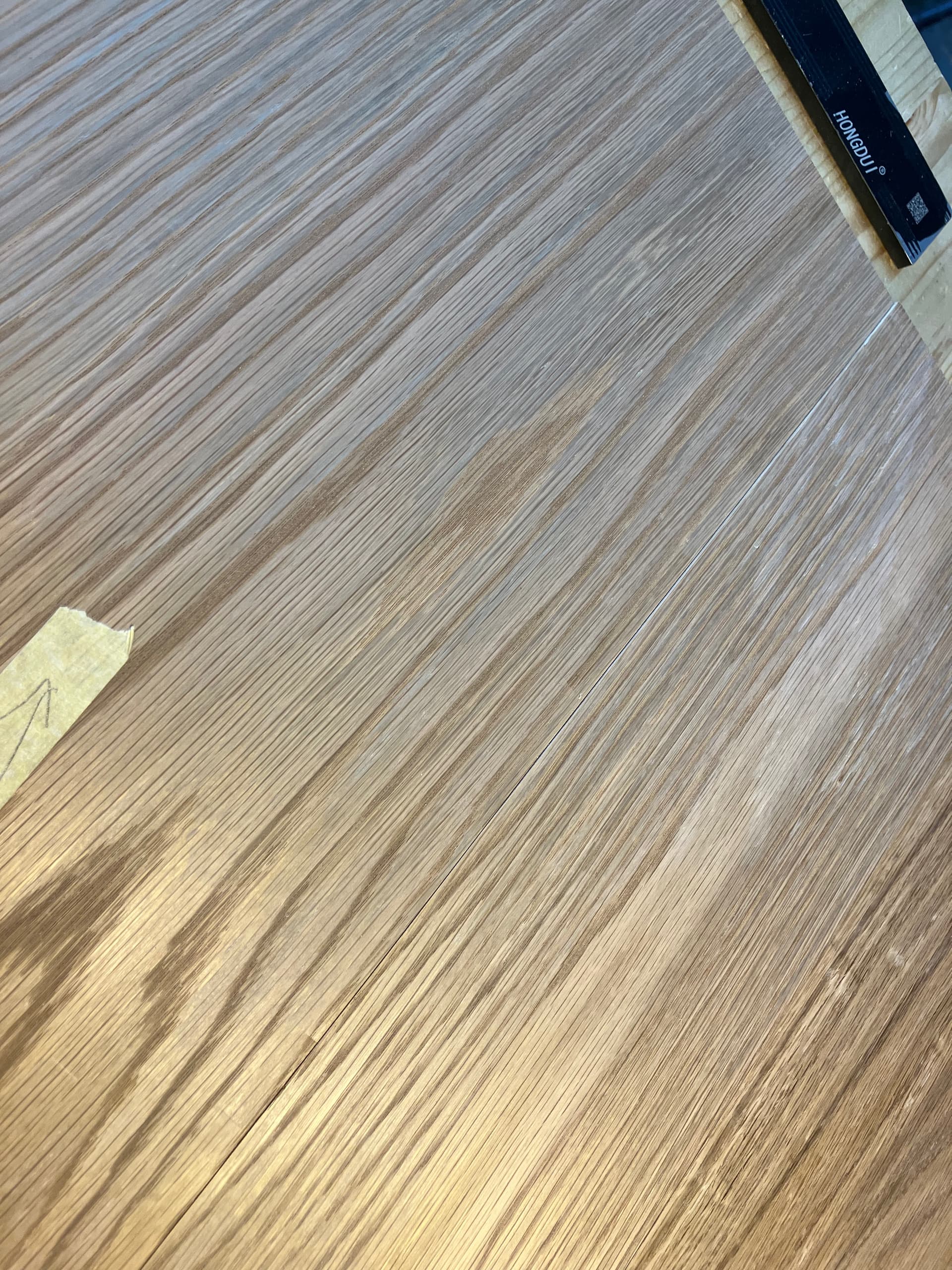 Estoy haciendo el sobre de una mesa de centro en roble . Conseguí unos tablones cepillados pensando que evitaría parte del trabajo más duro. Estaban cepillados a máquina y aunque tenían algunas ondulaciones, pensé que no me darían problemas en dejarlas perfectamente acabadas.