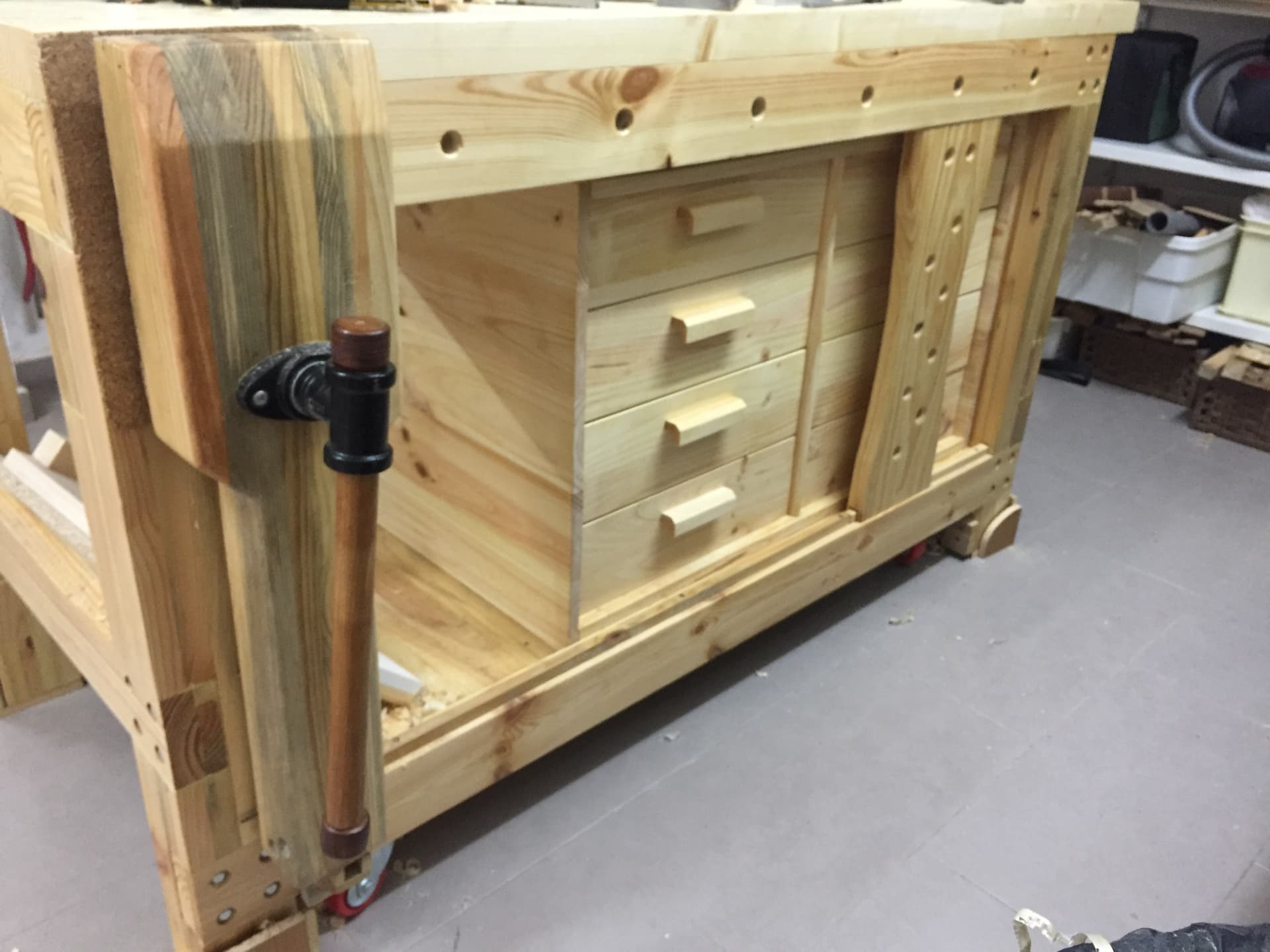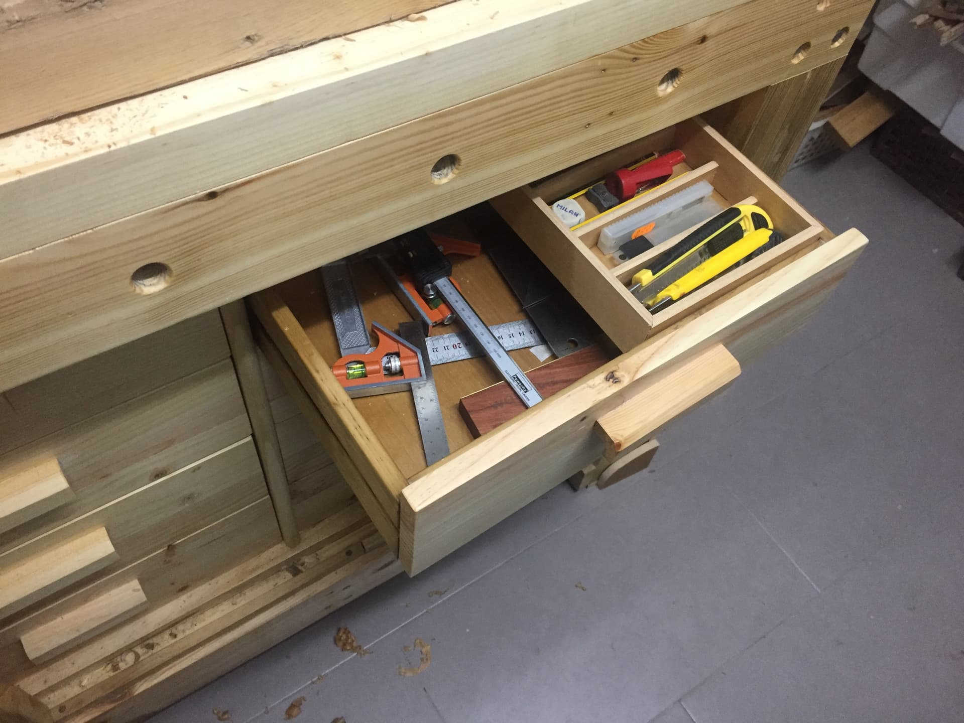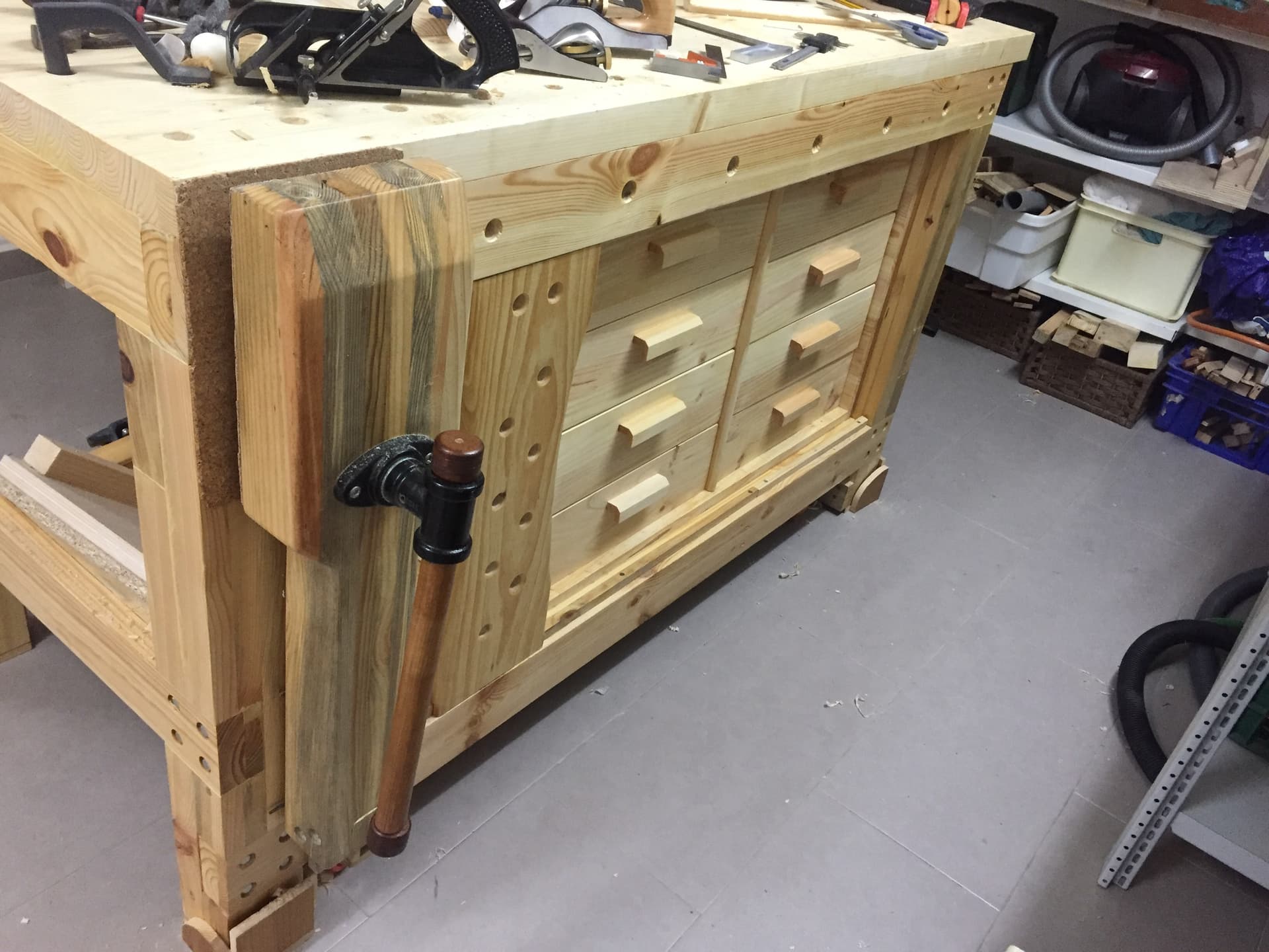 Bueno, pues refloto este hilo porque ya he terminado la cajonera del banco de trabajo. He construido un módulo que por un lado del banco tiene acceso a 8 cajones y por el otro lado, estantes para herramienta en sus maletines. Los cajones son reciclados de un mueble que encontré, sólo tuve cambiarles los frontales. Esta vez el modulo y frontales son tablero de pino de 18 mm comprado en gran superficie .