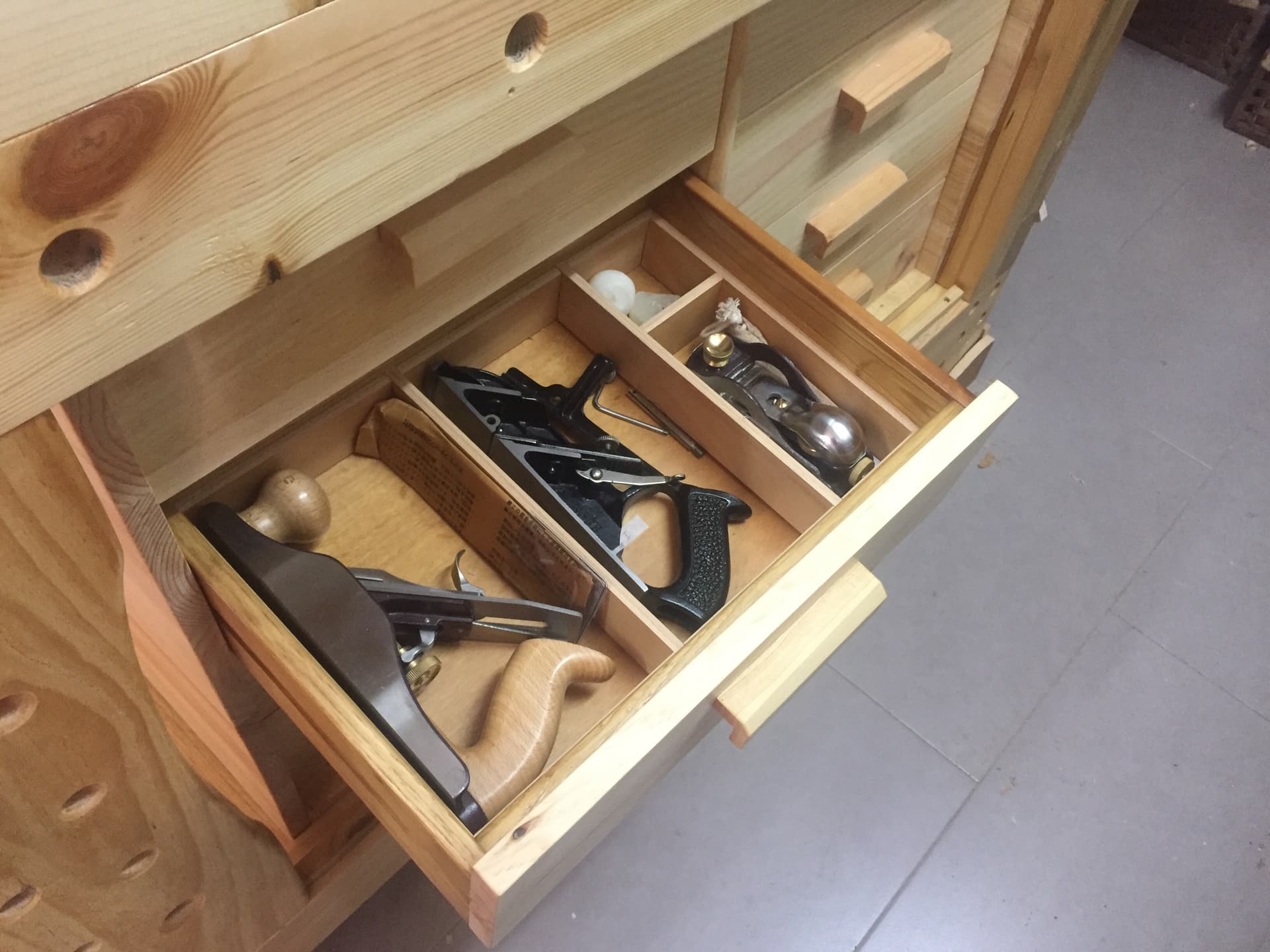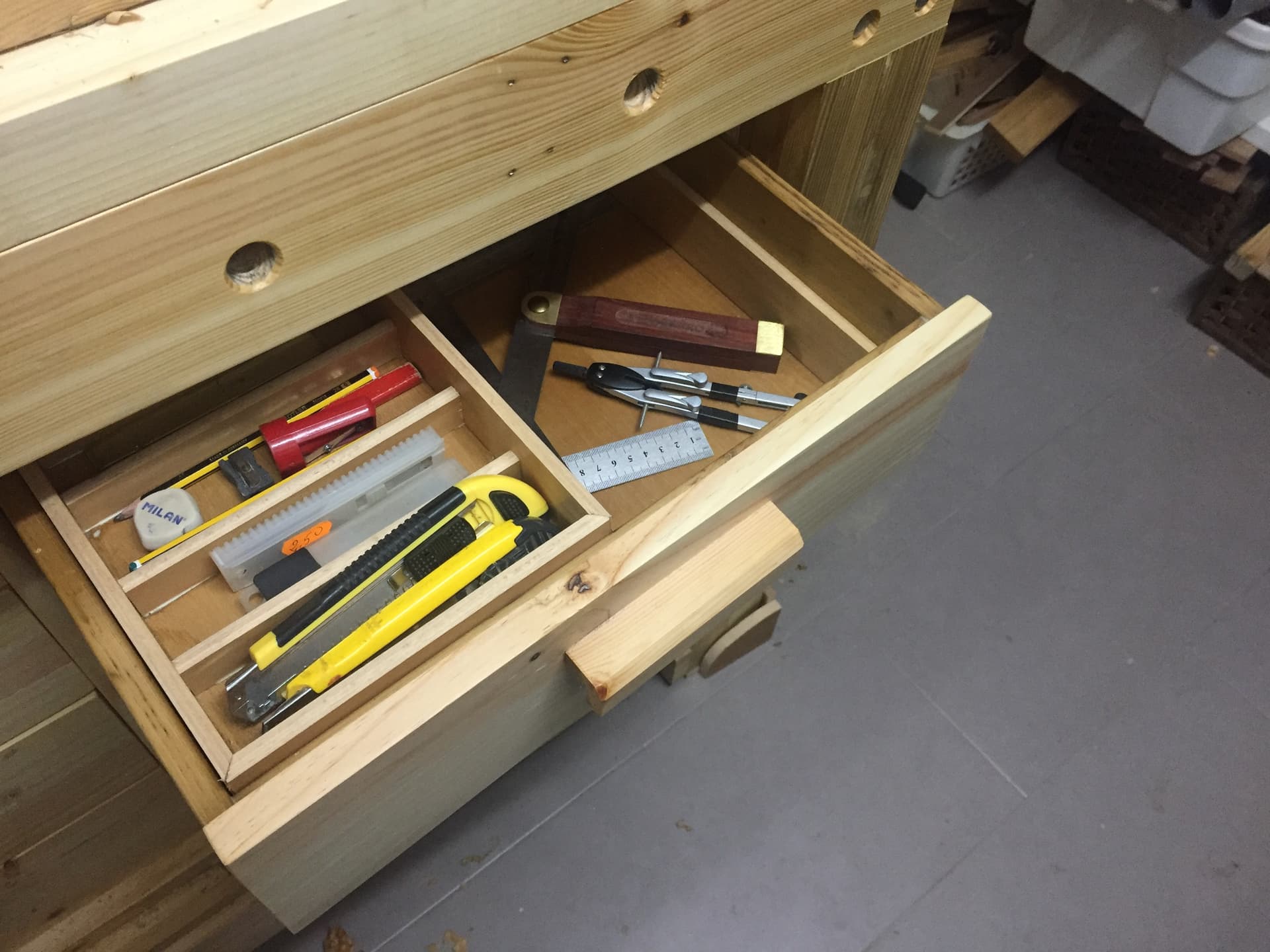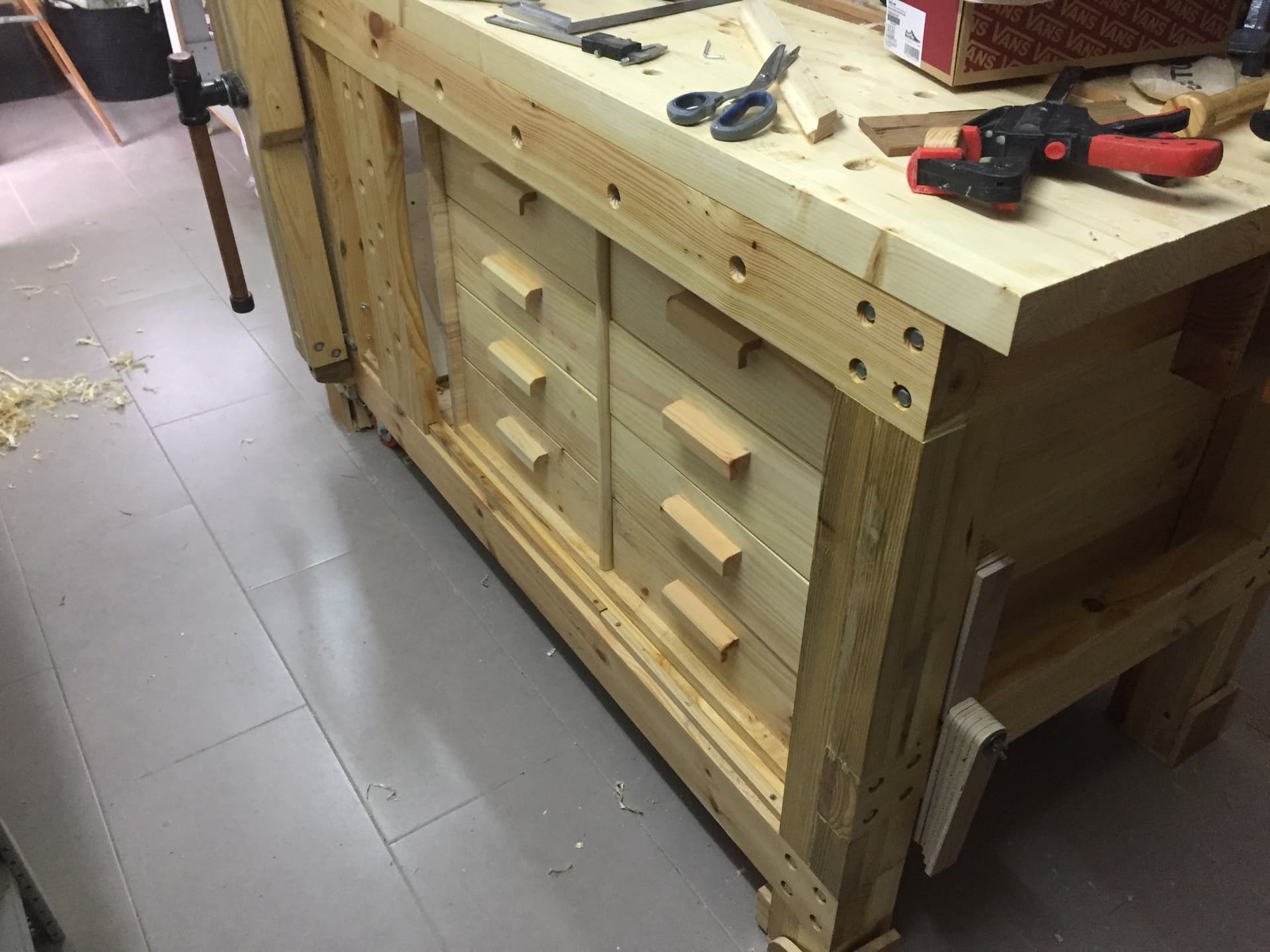 Bueno, pues refloto este hilo porque ya he terminado la cajonera del banco de trabajo. He construido un módulo que por un lado del banco tiene acceso a 8 cajones y por el otro lado, estantes para herramienta en sus maletines. Los cajones son reciclados de un mueble que encontré, sólo tuve cambiarles los frontales. Esta vez el modulo y frontales son tablero de pino de 18 mm comprado en gran superficie .