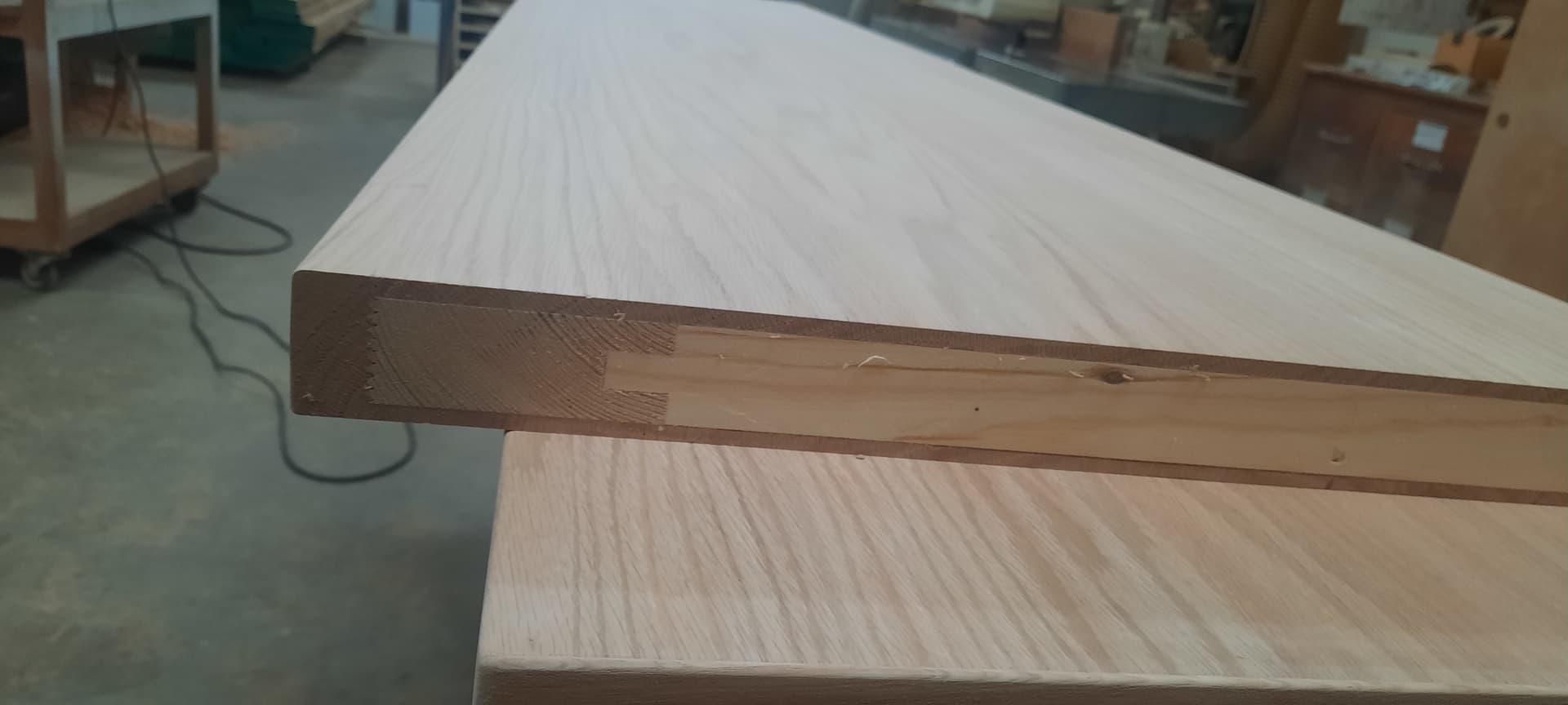 El contrachapado tiene una chapa de milimetro y esto son 7 mm de madera. Al final, te queda una mesa similar a maciza, con 7 mm de roble que le aporta una dureza similar a macizo. Estoy empezando a trabajar con prensa de platos y tampoco se muy bien resultados de los trabajos, que espero no tener problemas pero ya se sabe cuando haces cosas nuevas, que vas aprendiendo a golpes…