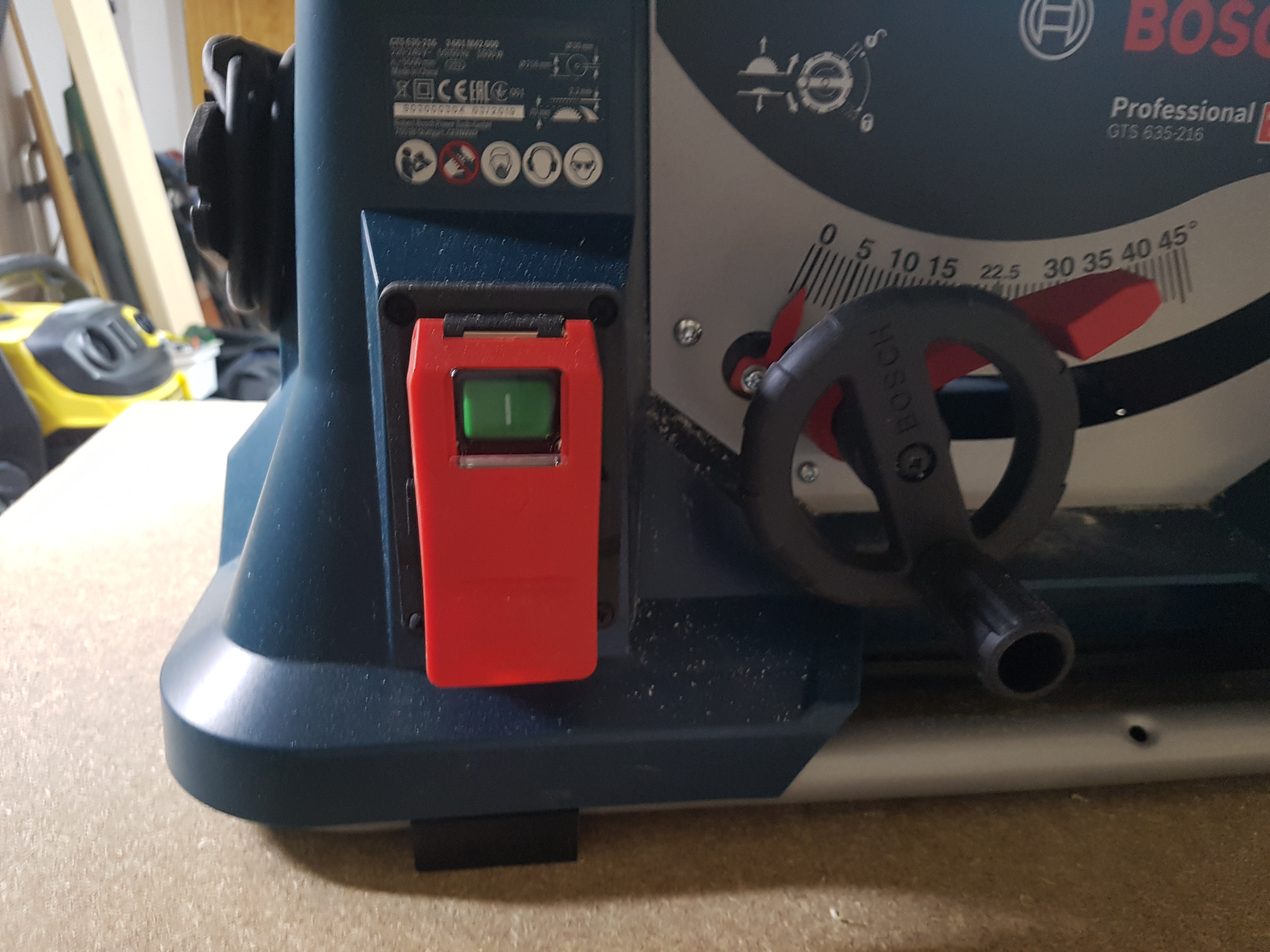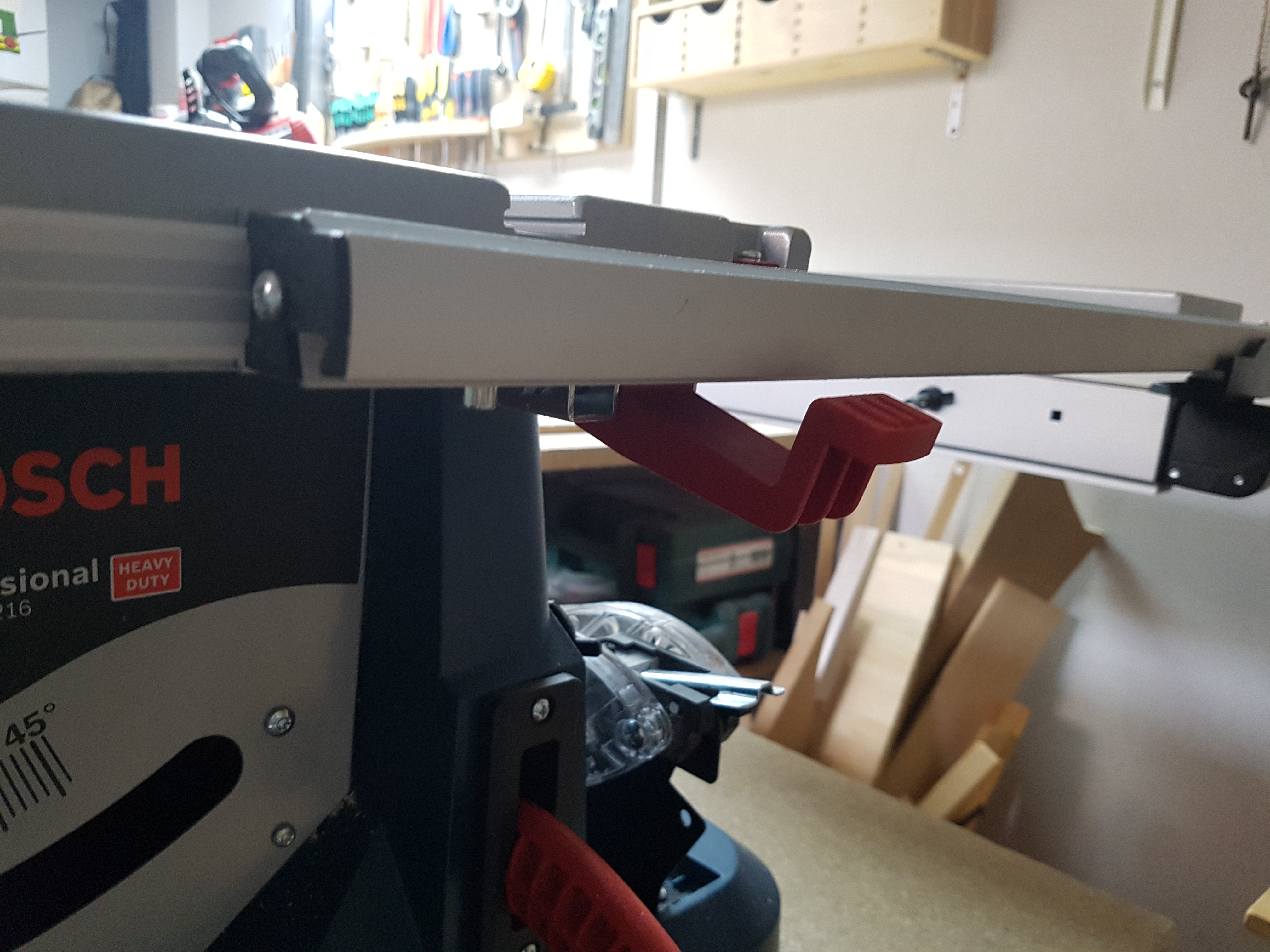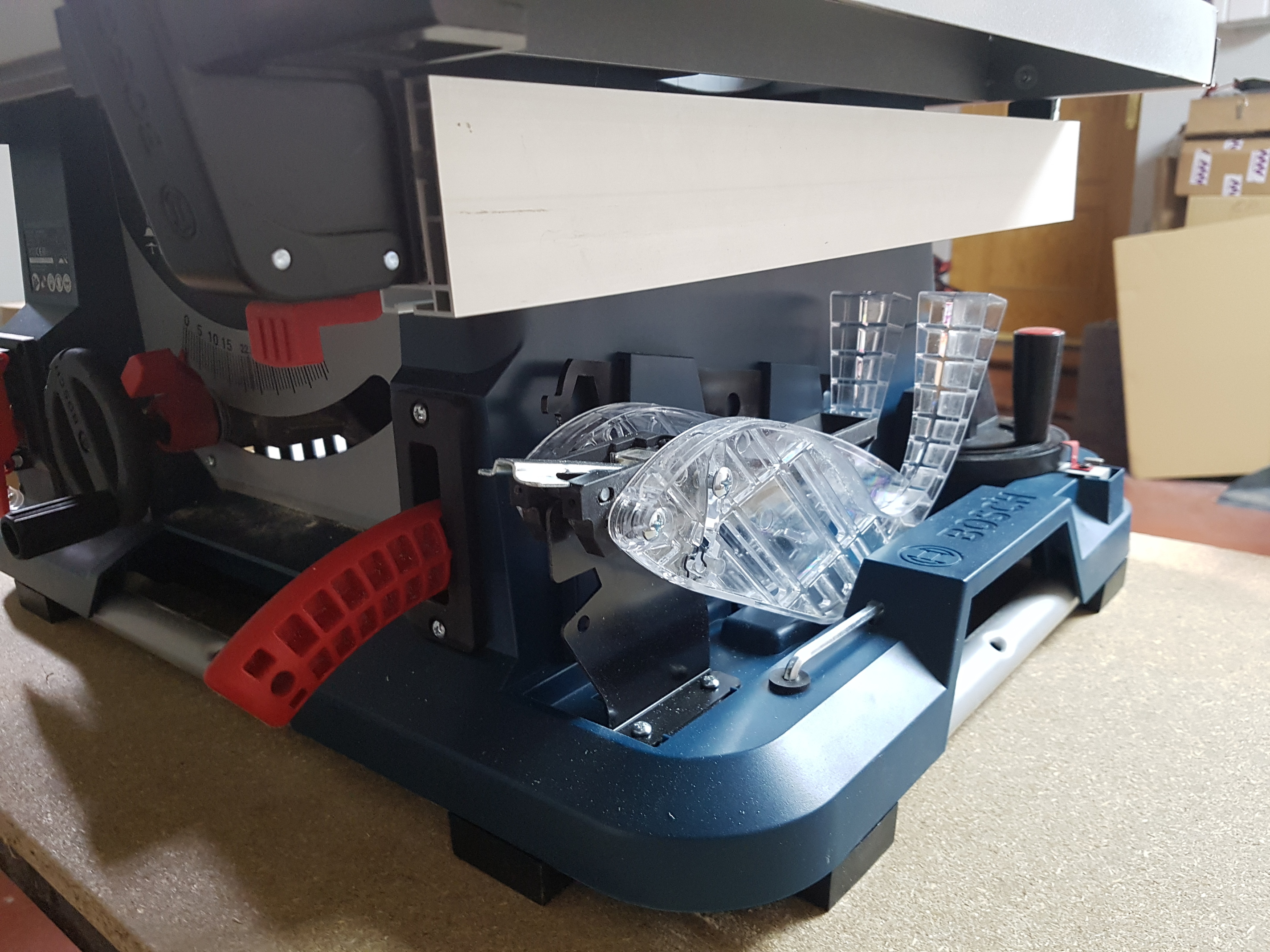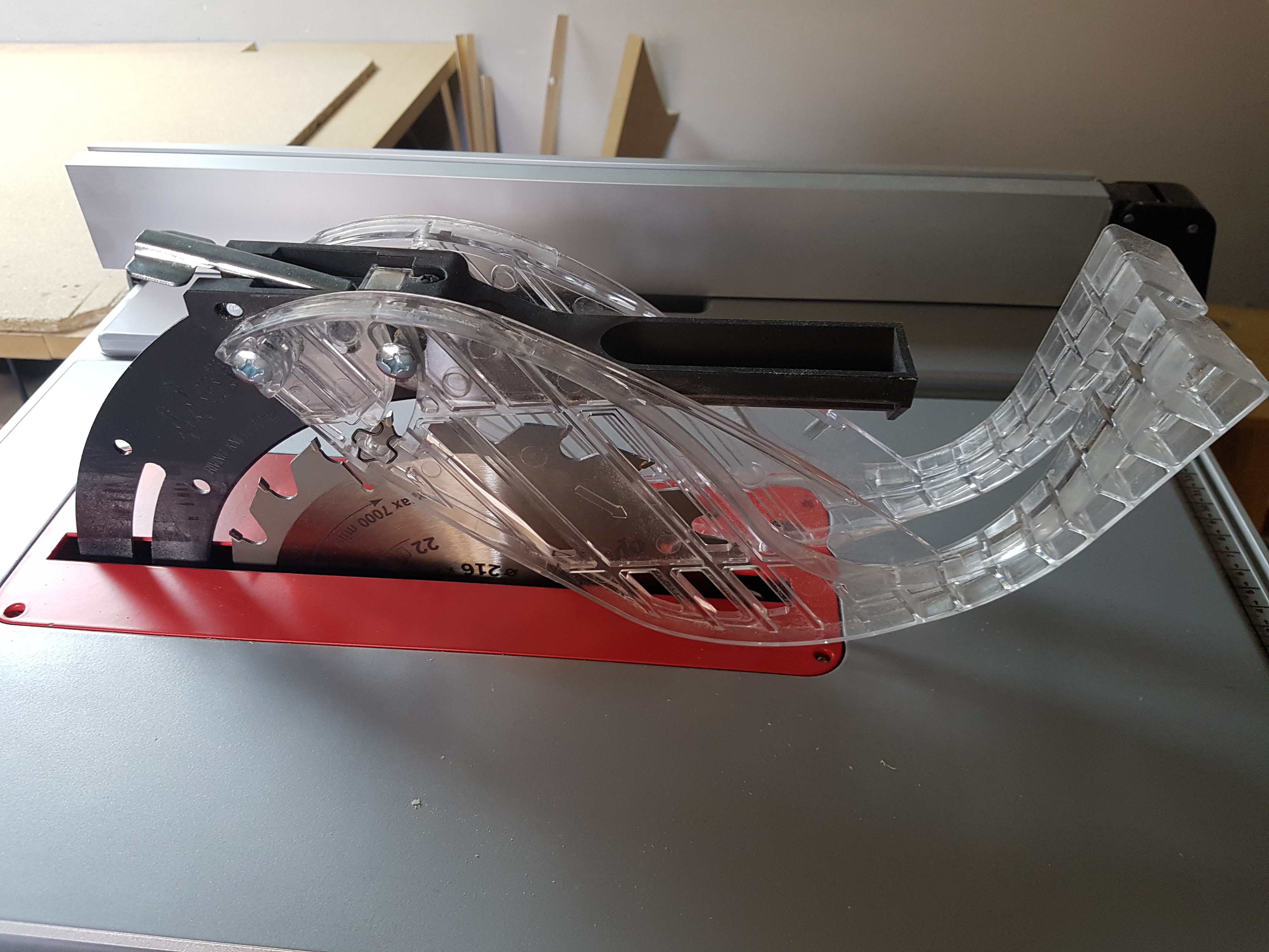 El protector de la sierra es bastante cómodo de usar… Tiene una palanquita de metal que hace que quitarla y ponerla sea mu rápido y sencillo. Tiene una posición en que ambos protectores quedan enclavados hacia arriba permitiéndote tomar medidas más cómodamente.