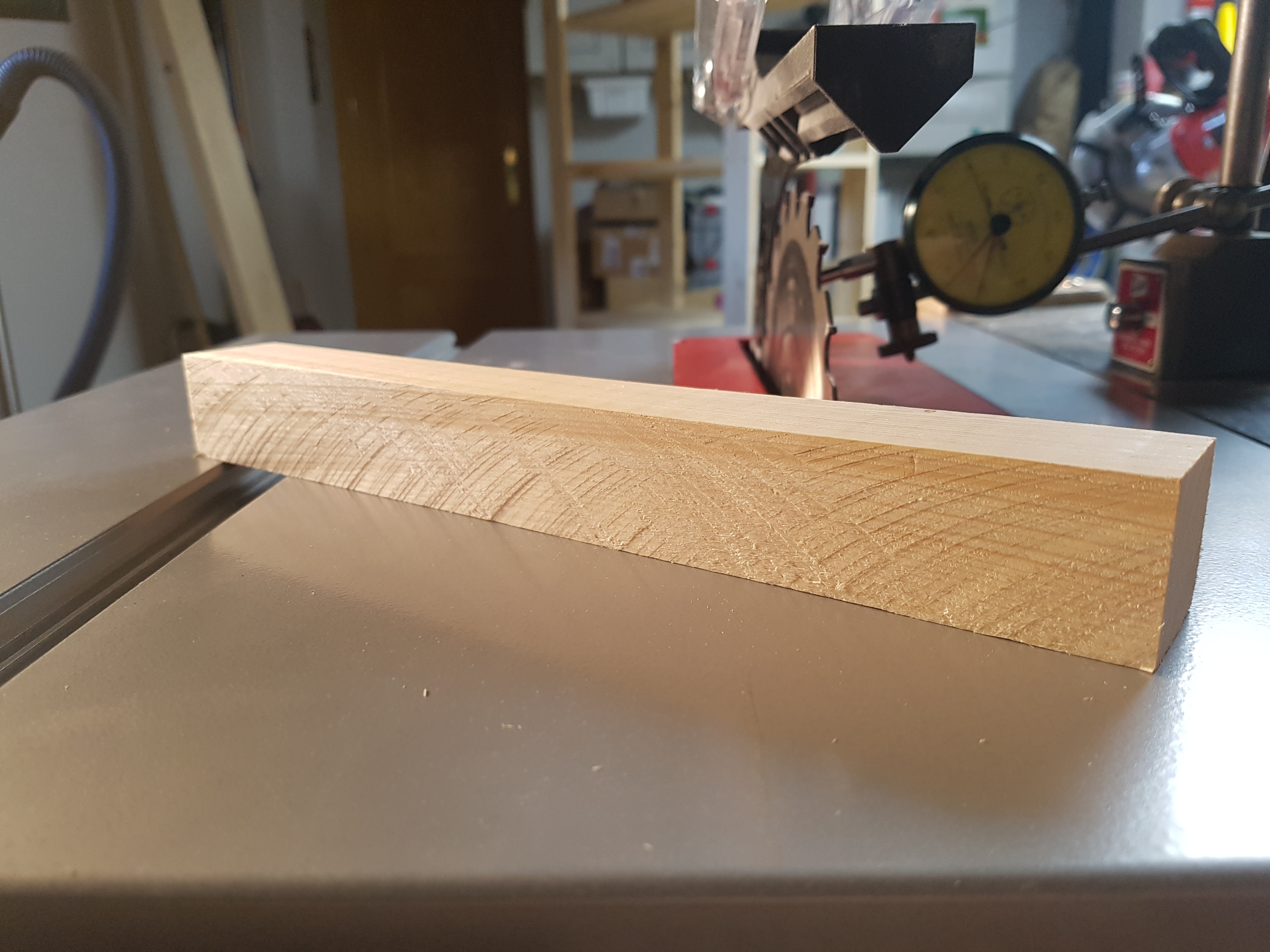 Cuando el material es alto lo mejor es poner la altura del disco un par de centímetros más alto que la mitad de la altura de la madera, haces primero una pasada y luego giras la madera para cortar la otra mitad apoyando la misma cara en la guía. El corte no saldrá perfecto pero quedará mejor que el de la foto. También tienes que ir calculando la velocidad de alimentación, eso te lo dará la experiencia. Un avance muy lento puede quemar la madera; uno muy rápido puede combar el disco y/o forzar el motor.
