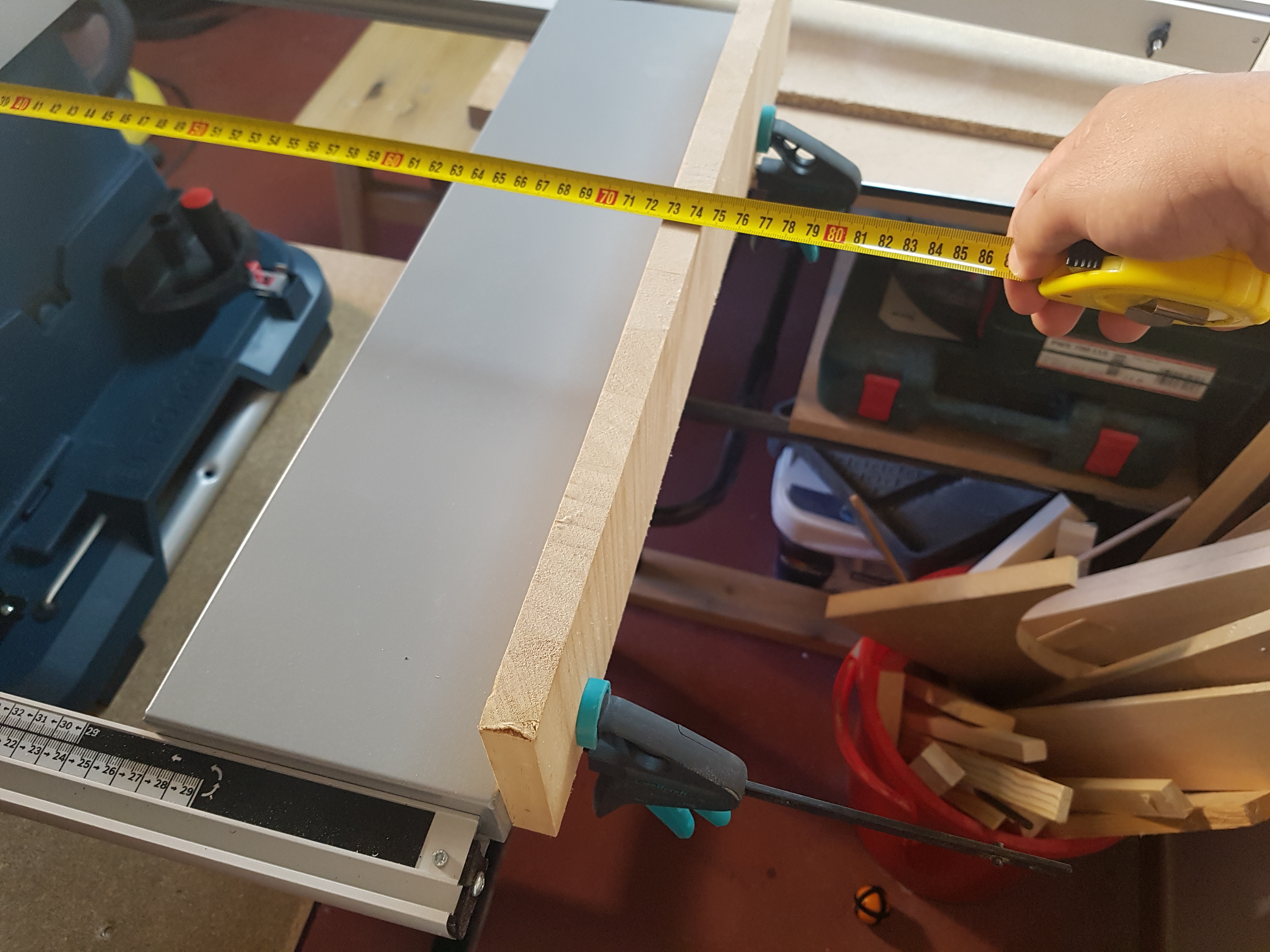 Usando la guía paralela no… La mesa no abre lo suficiente. Como mucho unos 65cm…pero quizás sujetando a la mesa extensible algún listón con sargentos si que da la medida… Pero habrá que ajustar la mesa para que quede paralela al disco.