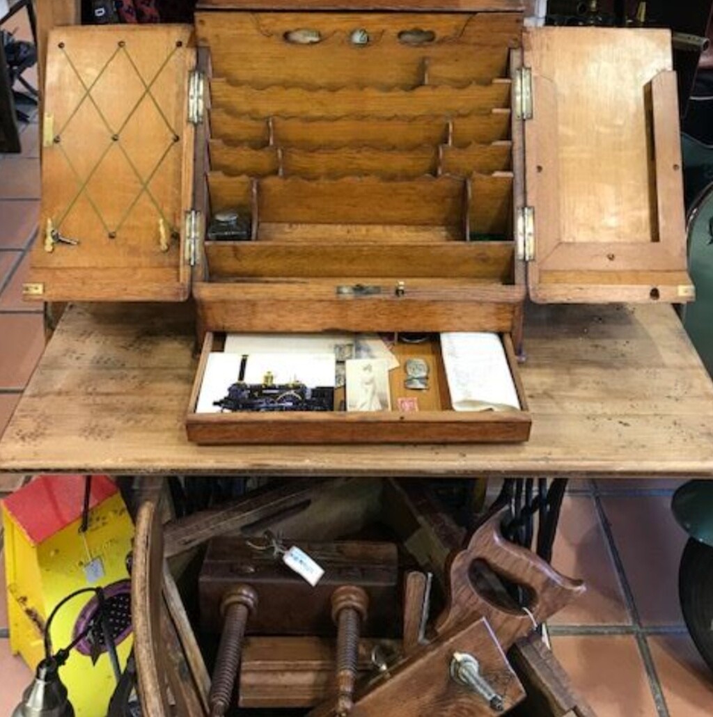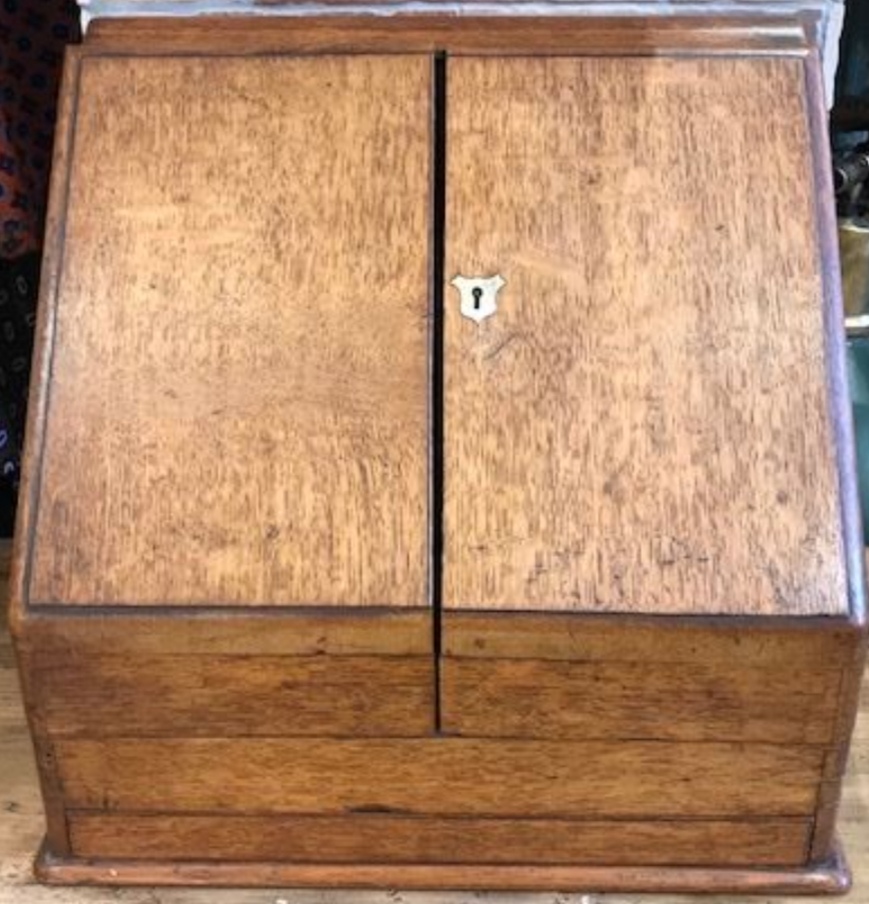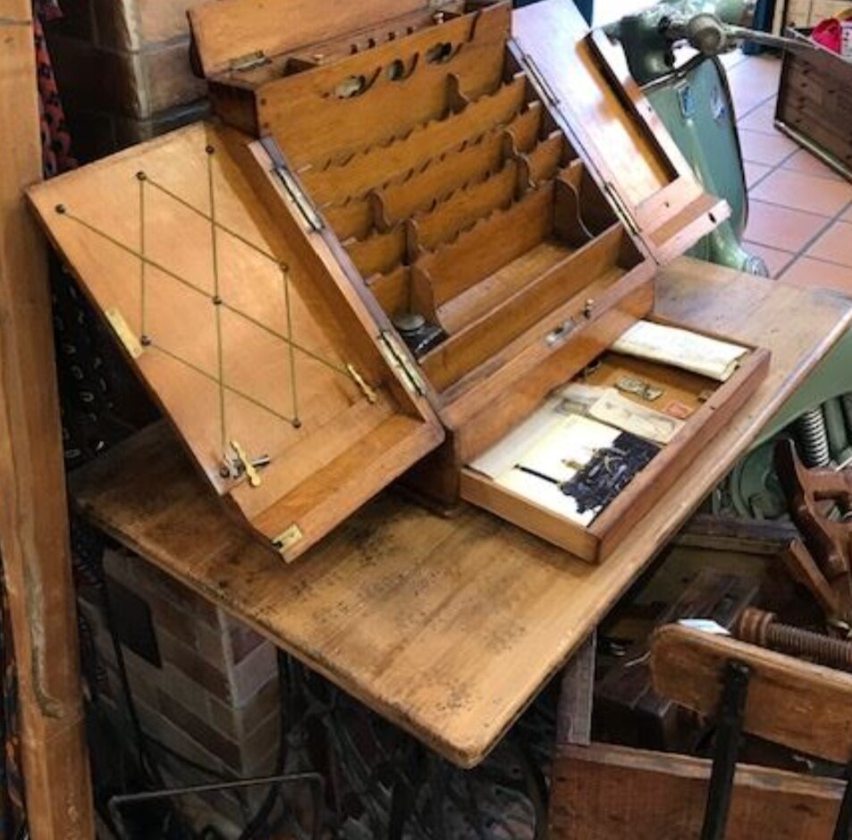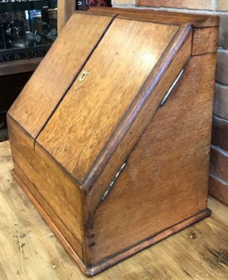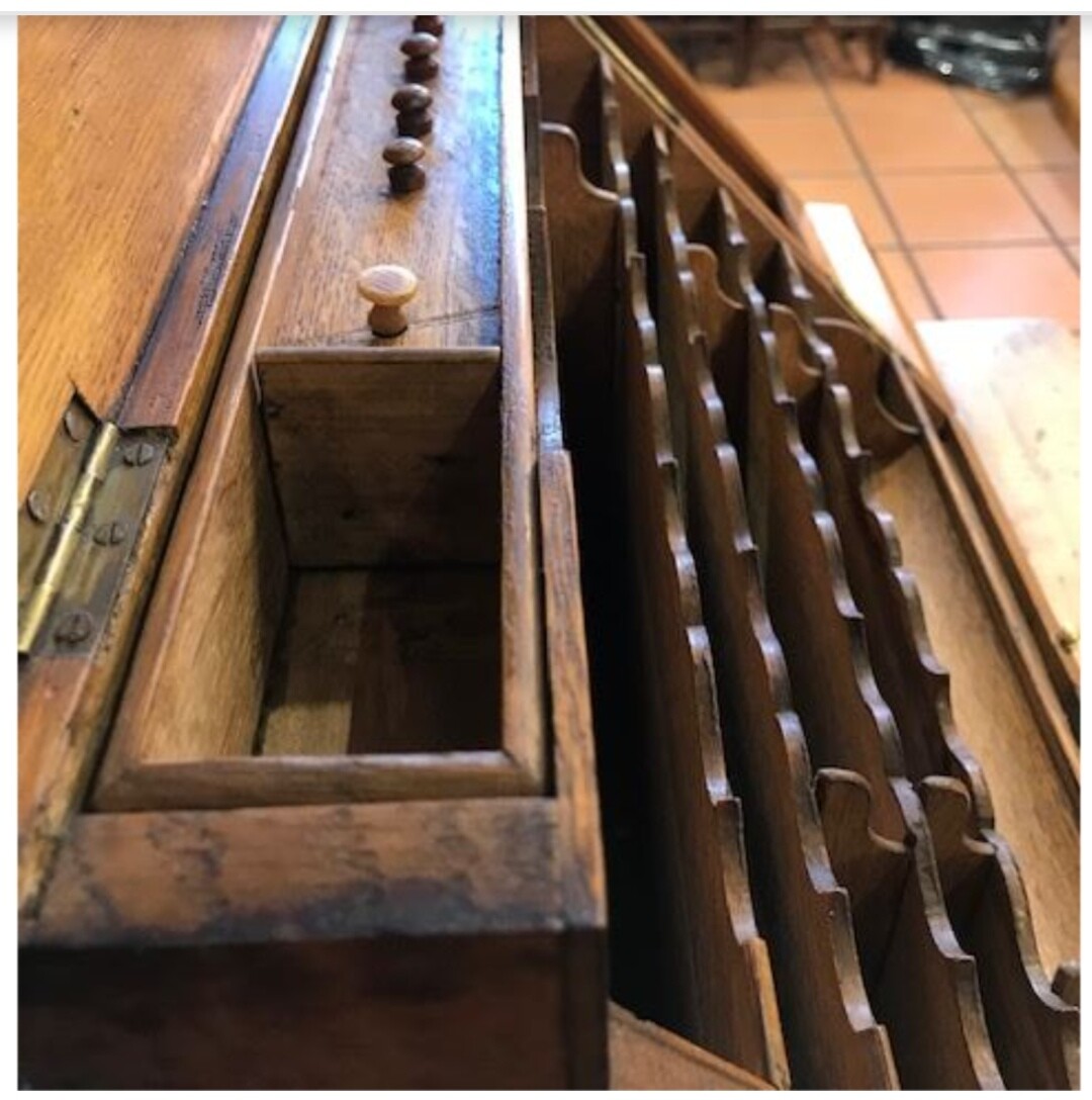 El que tiene mi amigo se lo compró a una señora de la zona. Sus antepasados eran gente con muchas tierras y ese mueble lo llevaba su Secretario/Administrador cuando iba visitando las fincas para anotar resultados del cereal, la almendra, la vid, etc.
