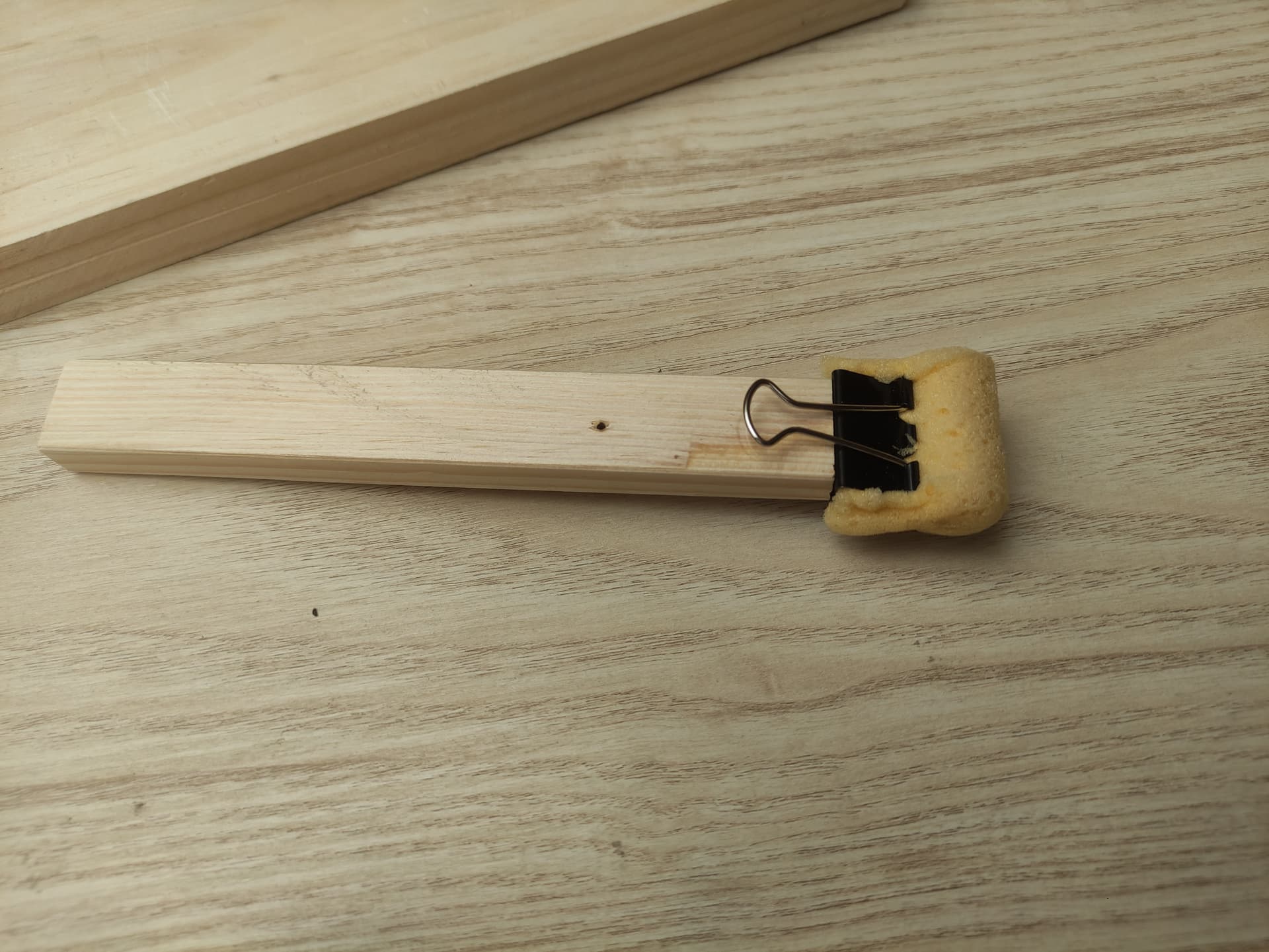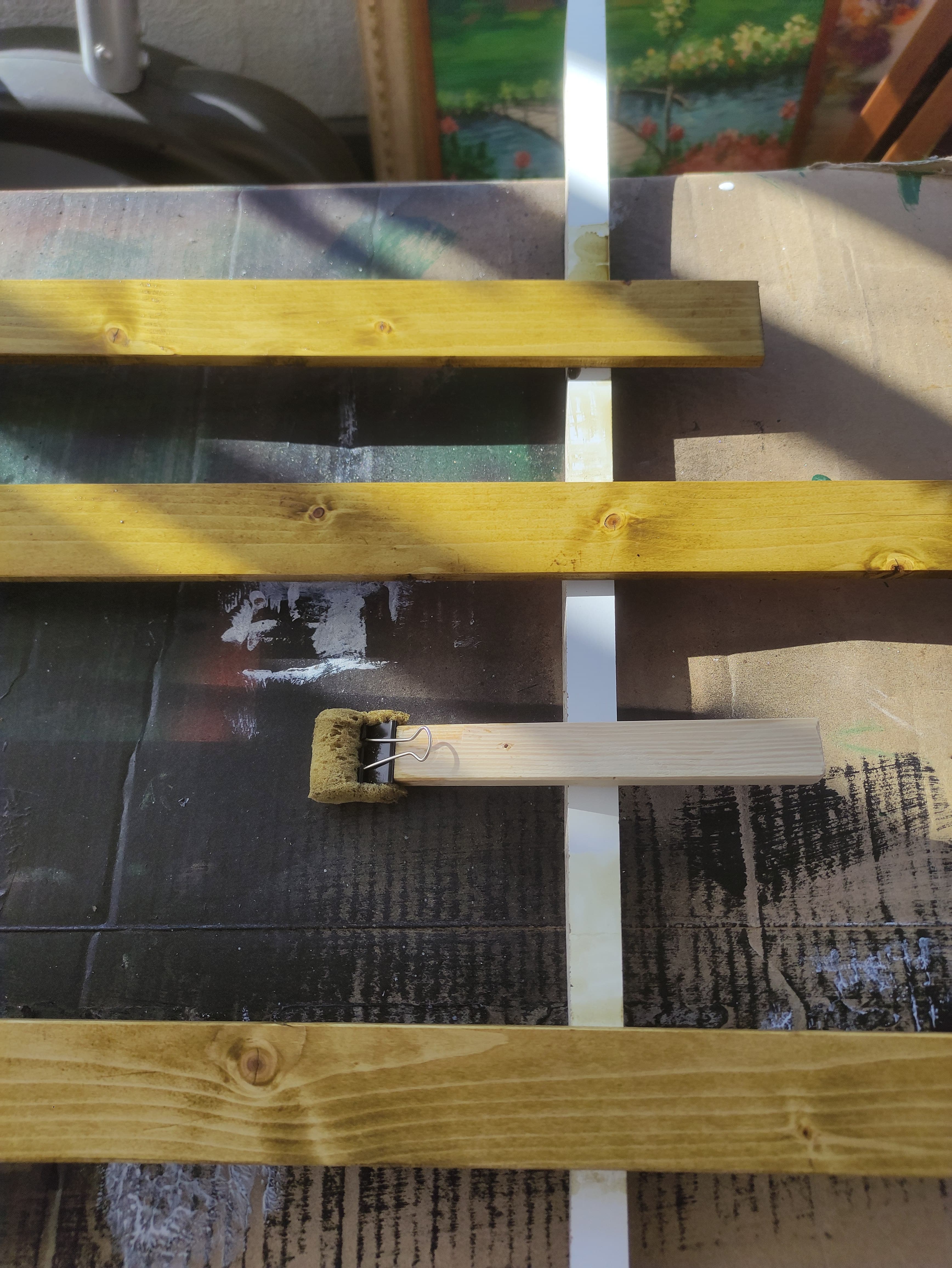 No lo había dicho, en el vídeo lo hacen con los mismos mangos de las brochas, yo lo hice con un simple palo que le di algo de forma…es una pinza de oficina, atornillada a la.punta del palo.