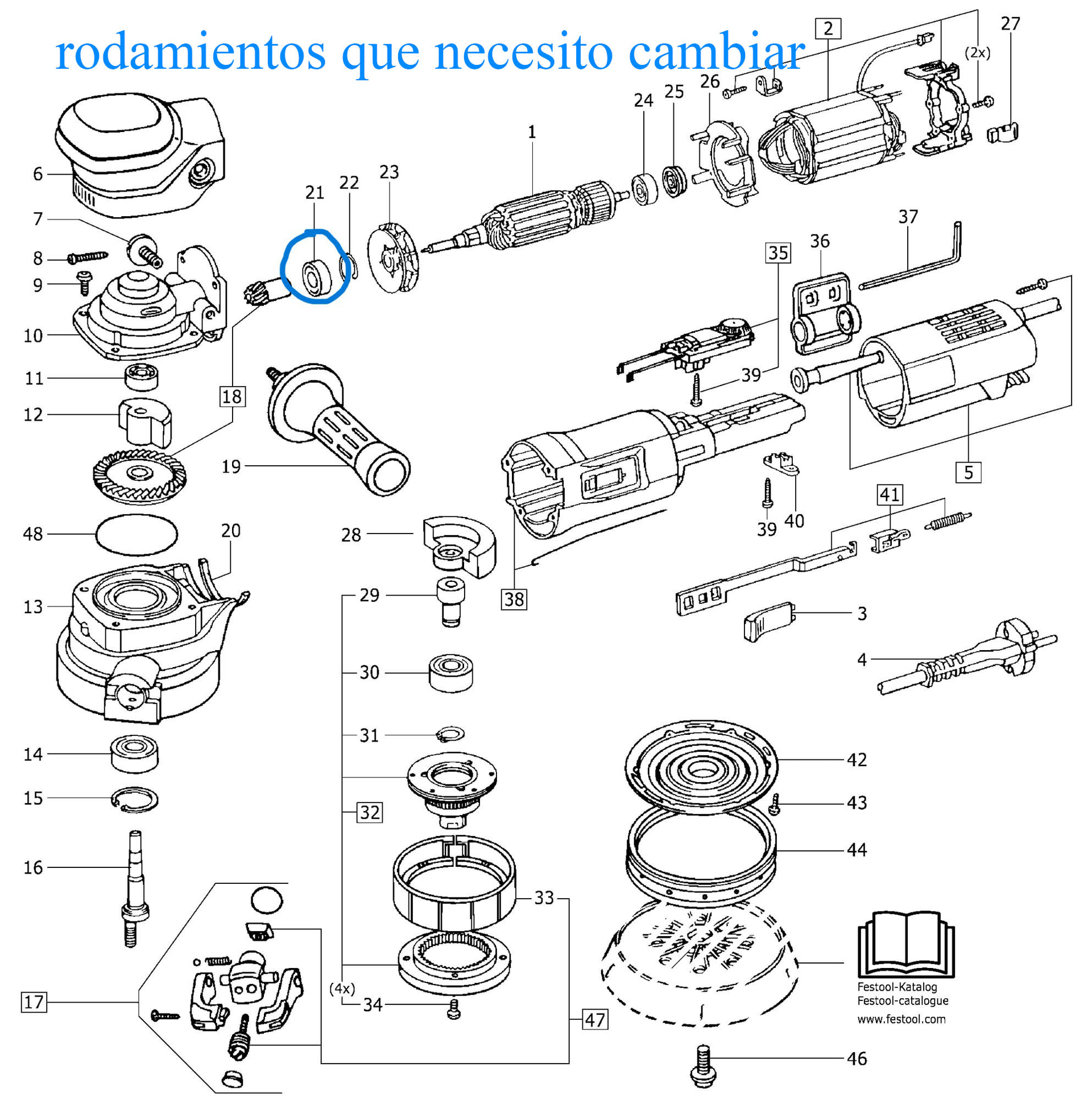 estoy intentando desmontar mi vieja festool ro 150E para cambiarle los uno de los rodamientos. Pero no se como desmontar una parte para poder cambiarlos. Si alguien sabe, o tiene alguna idea de como poder sacar el engranaje para poder acceder a los rodamientos y cambiarlos, pues estaré muy agradecido. Gracias.