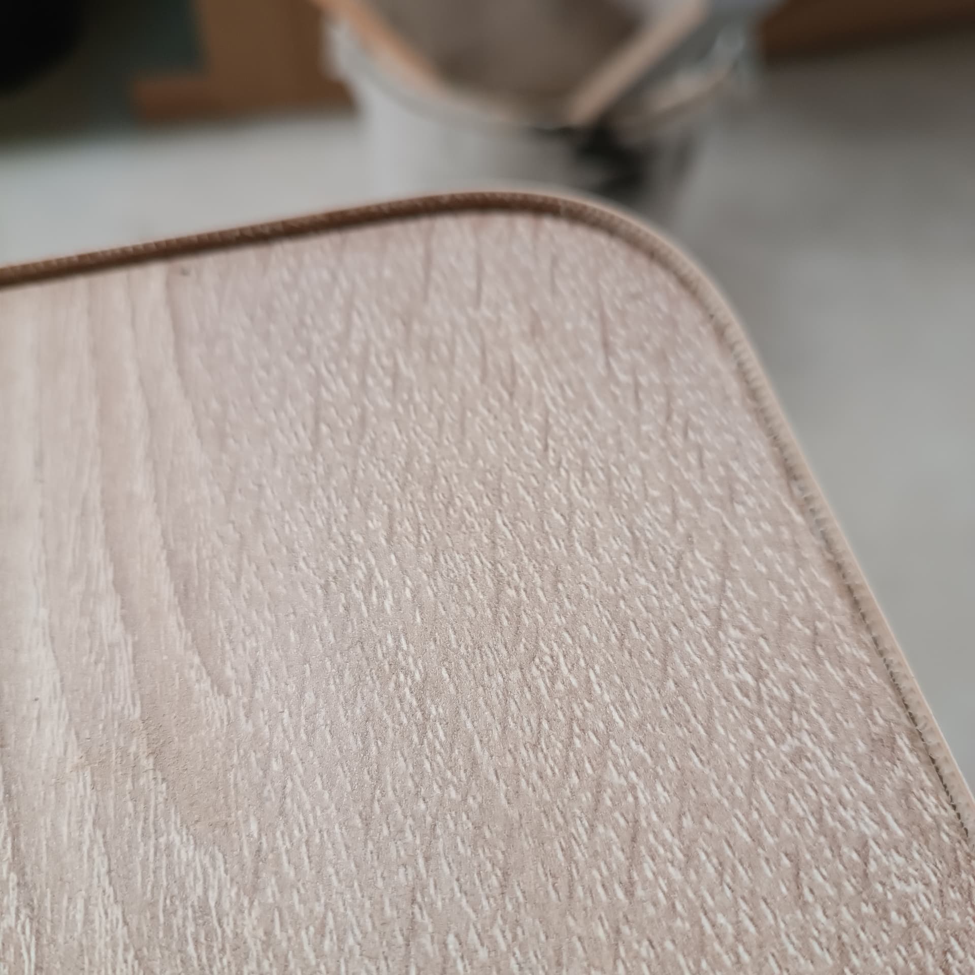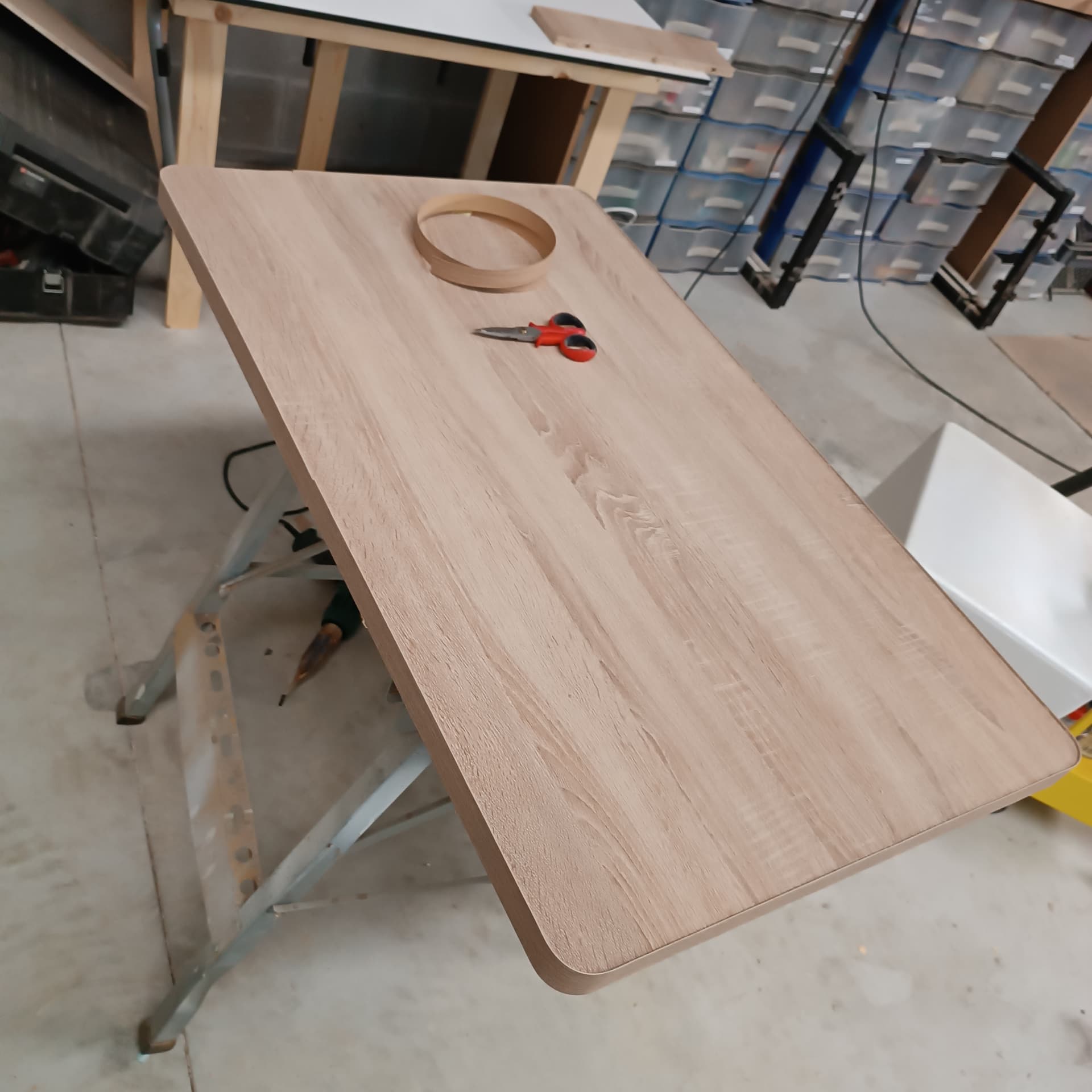 Pero claro, en redondo, no hay canal que valga, y despues de darle vueltas, lo mas sencillo y mejor queda, es que la parte inferior del canto, quede al borde de abajo del tablero tocando la mesa de apoyo, y perfecto.