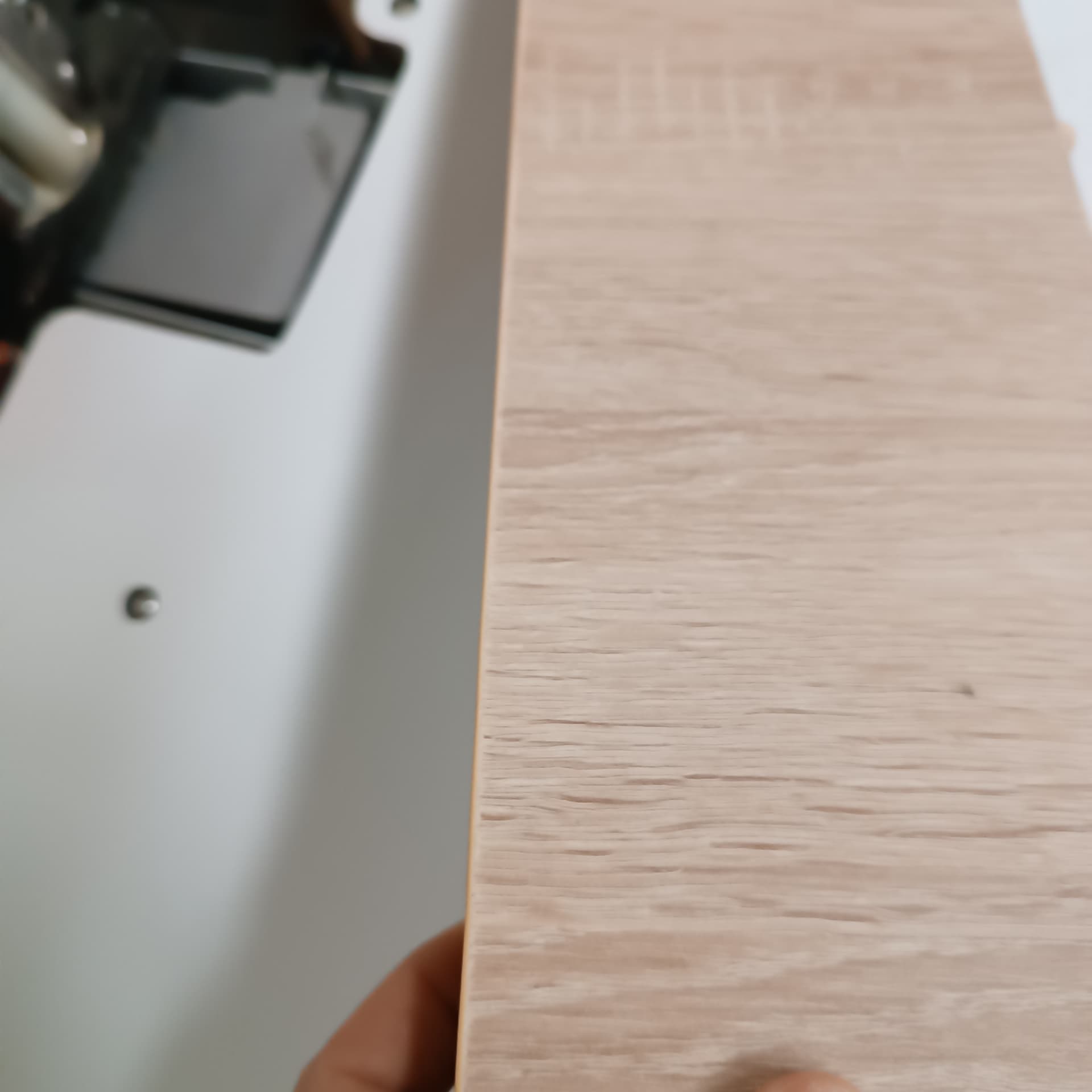 Como gaste casi todo el rollo de canto con las pruebas moviendo la maquina (fatal, @Angel espero que tu le pilles el punto, yo la prefiero fija y mover la.pieza) pues lo he tenido que hacer en dos trozos, y el segundo, al terminar, con el ansia de cortarlo y no pegar demasiado, se me ha torcido un poco, iria bien una palanca para cortar con algun indicador exacto sobre que punto acaba, le dare una vuelta a eso.
