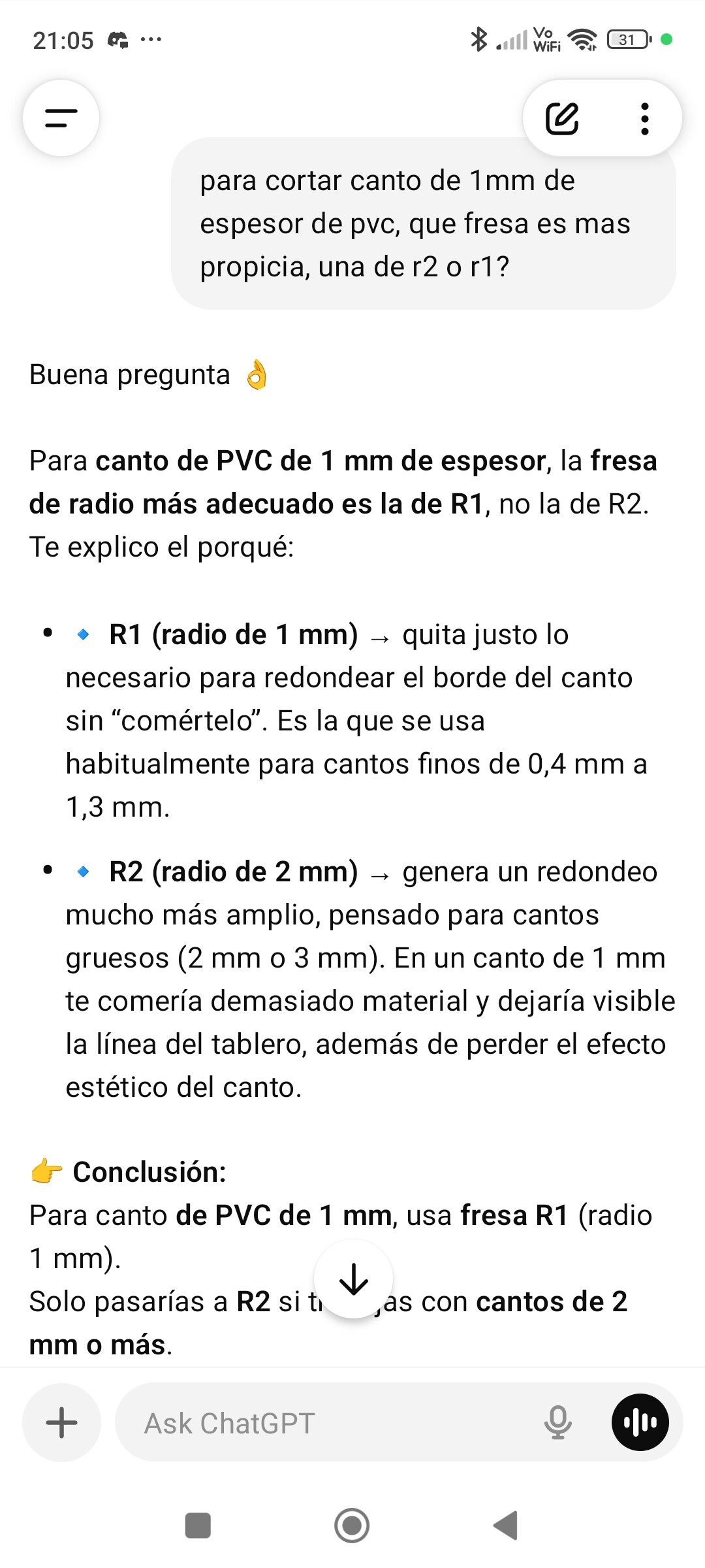 Yo tengo R1. Incluso la veo grande para canto de 0,8 o 1 mm y lo que hago es subirla un pelin para no hacer todo el radio ya que si no llegas a comer la totalidad del canto y tocas la melamina