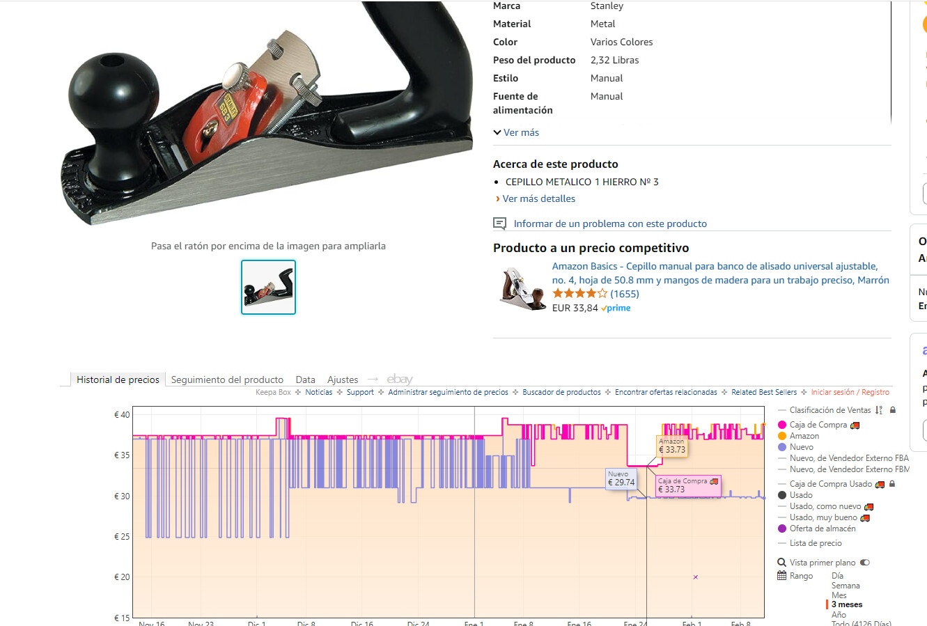 Pocos consejos puedo dar yo sobre temas de madera, ya que estoy empezando… PERO como asiduo comprador de muchas plataformas como Amazonia por otros temas (pesca, manualidades, etc…) si considero que algo puedo ayudar. Nunca te fies del tema de “descuento”, “oferta flash” y demas ganchos. Te aconsejaria que te descargues la extension de google chrome “keepa” . Ultrasencilla de añadir a tu buscador y hara que en todos los productos de amazon te aparezca un grafico con el historial de precios de ese producto en los ultimos meses/años.