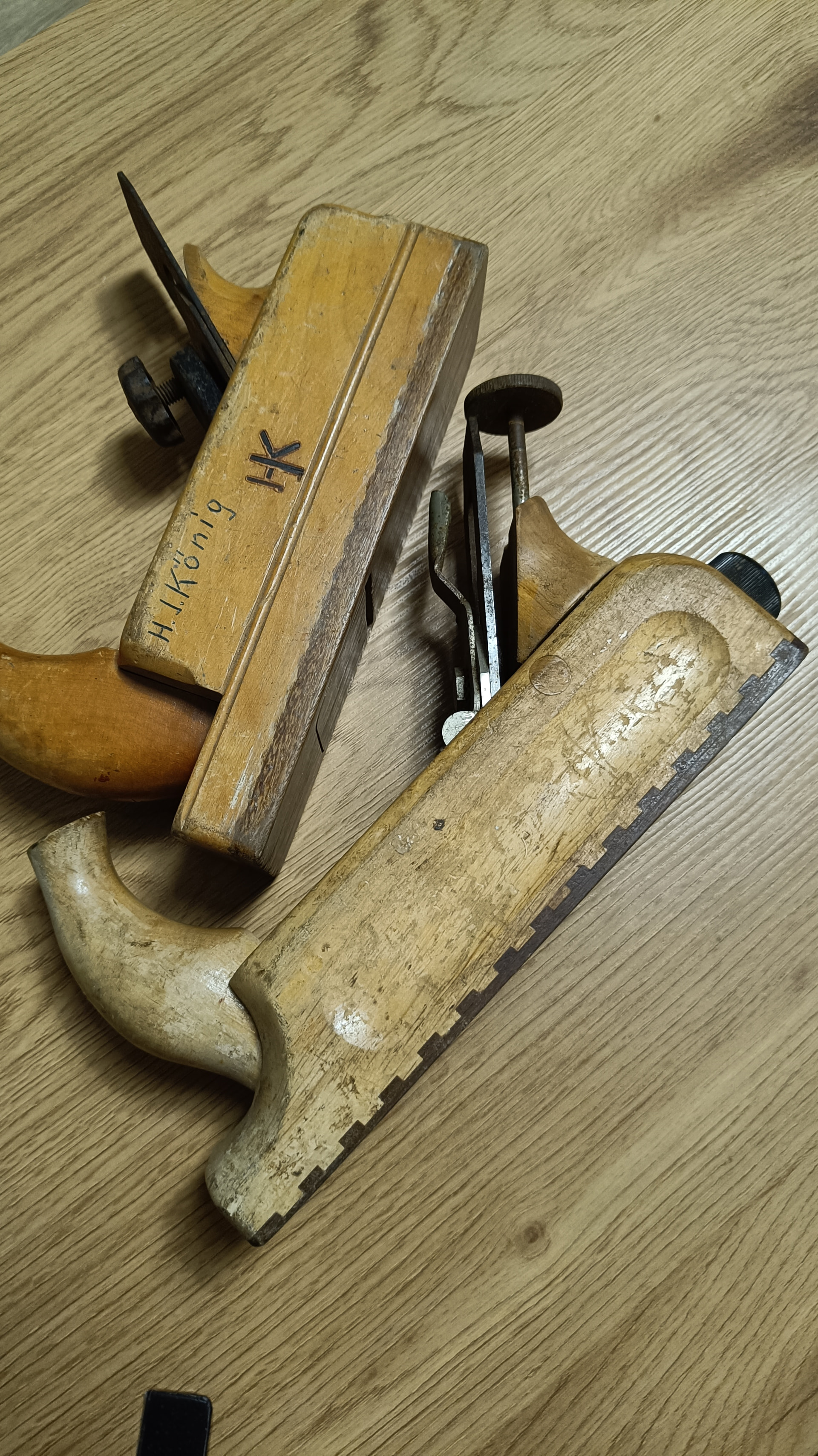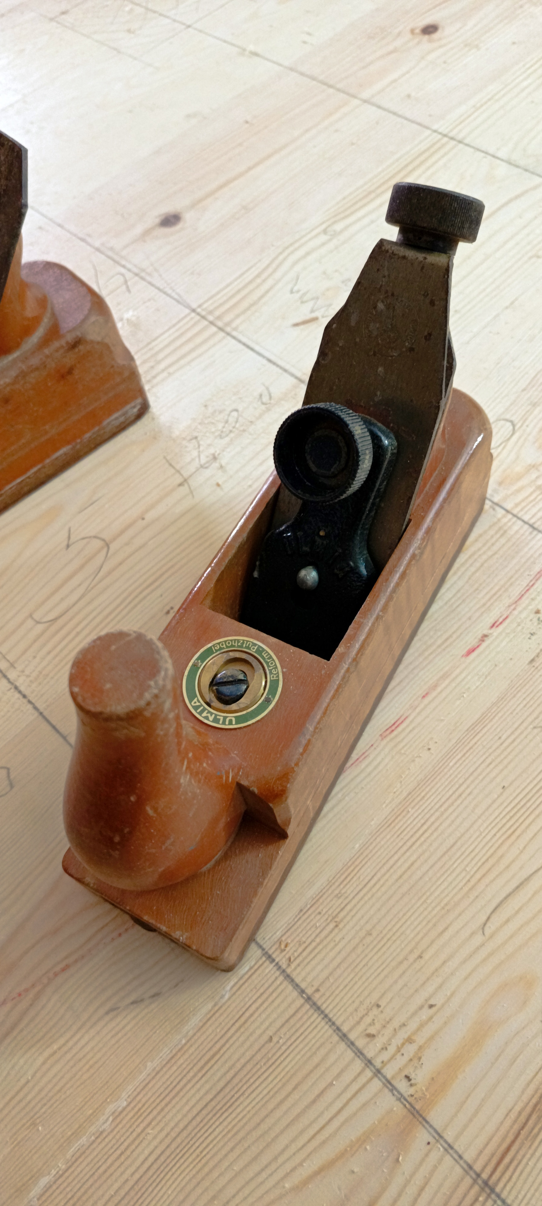 Dos cepillos de madera, uno parece que es un Ulmia 25-48, pero me descoloca que no tenga el ajuste en el frontal que se ve en algunos modelos, no sé si este sistema fue incorporado después de la fabricación de este cepillo.