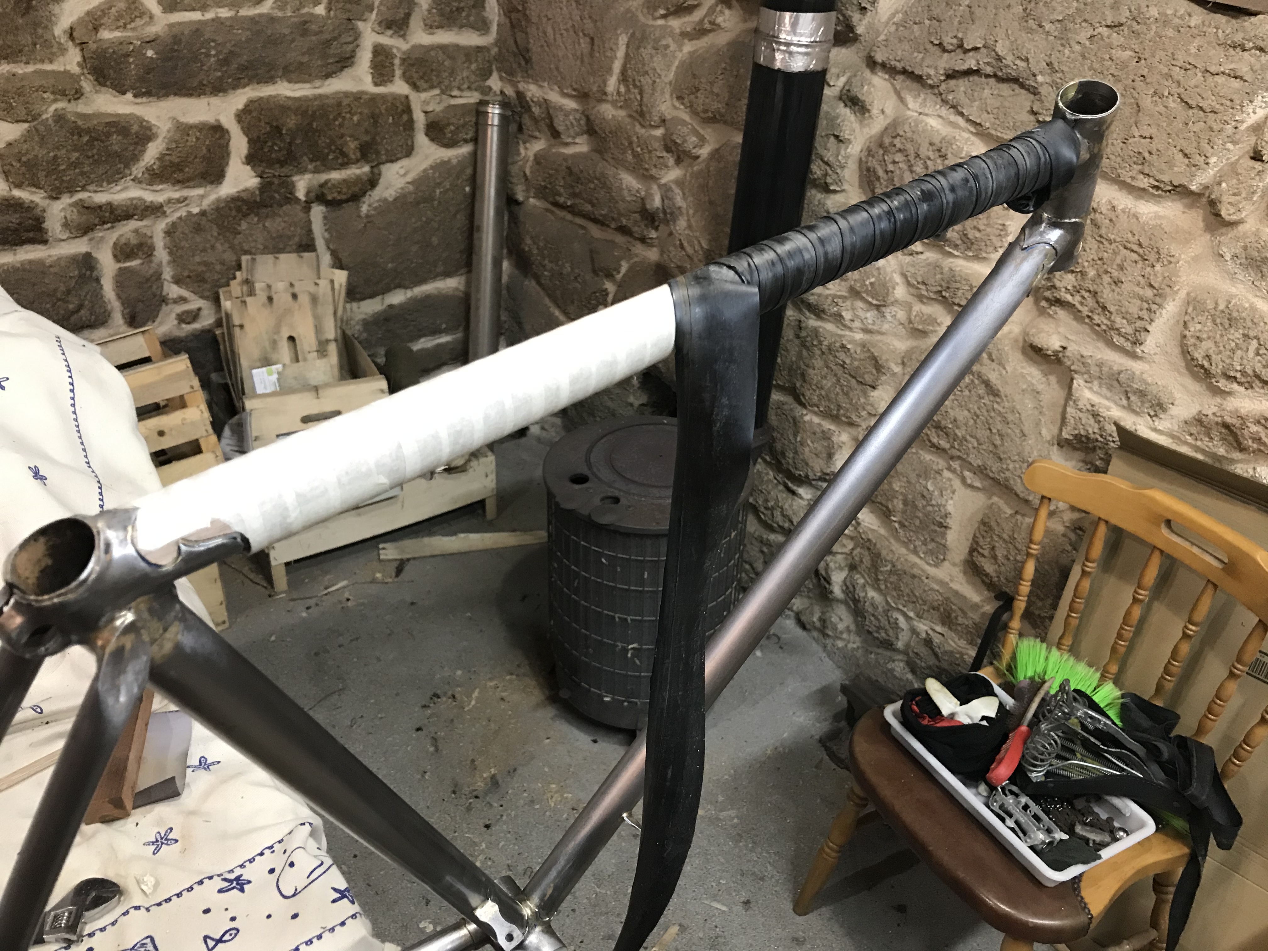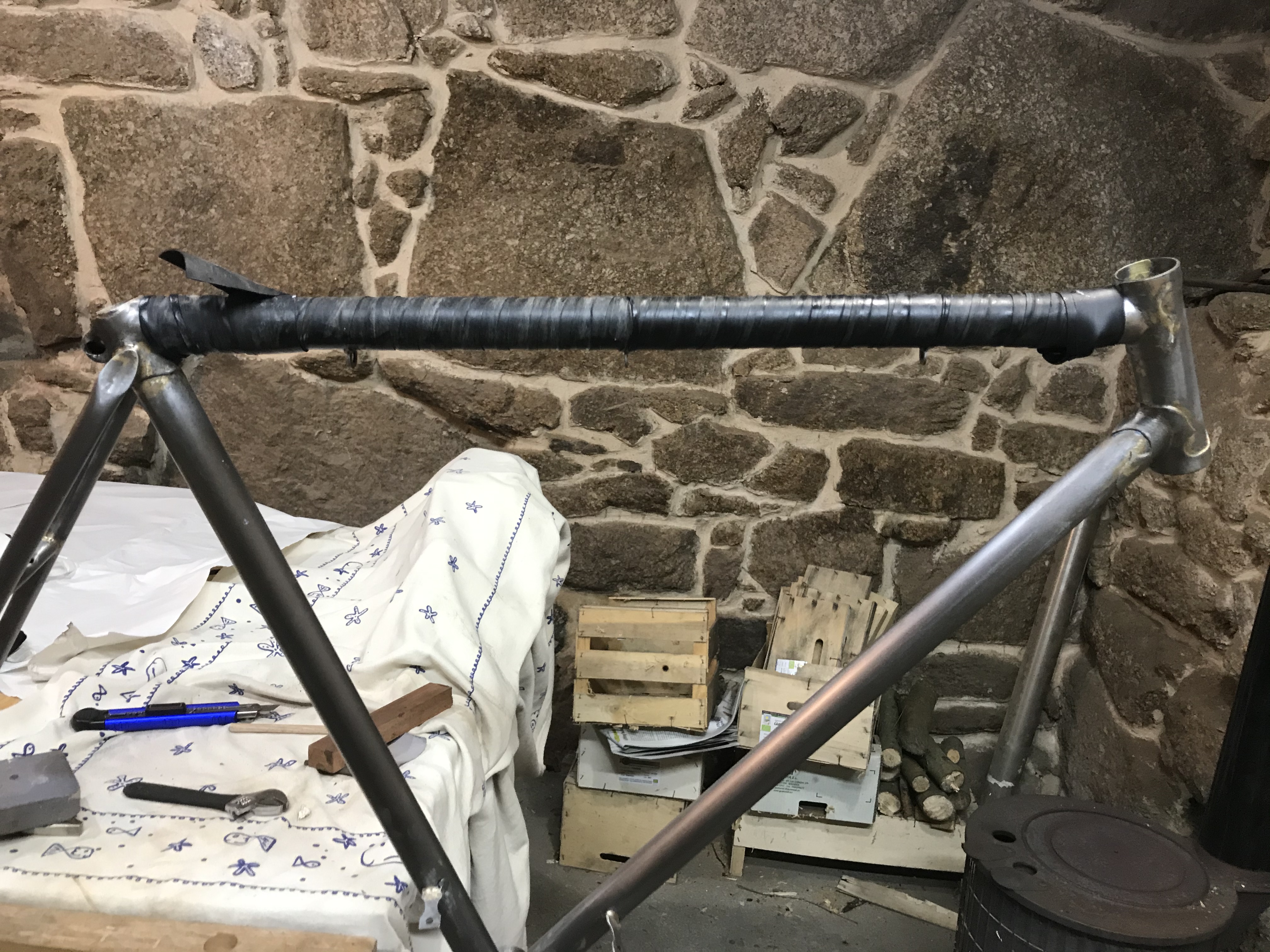 La chapa la he cubierto con cinta de carrocero y no se ha roto nada al envolver el tubo. Veremos mañana si soy capaz de despegarla y no tengo una amalgama de goma de cámara, acero, nogal y cinta de carrocero:joy: