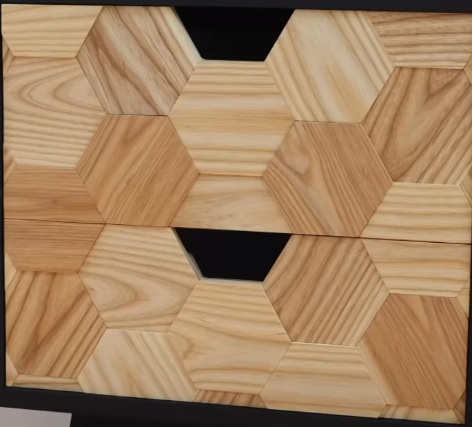 Pues se hacen los exagonos en dm de una medida que puedas utilizar una fresa con copiador superior,pegas la madera que quieres cortar sobre otro trozo de DM con cinta de doble cara,pegas las plantillas de la froma que quieras que tener el el dibujo y paciencia y muchas virutas…la unica limitacion es la separacion entre piezas que sera igual al copiador como minimo.