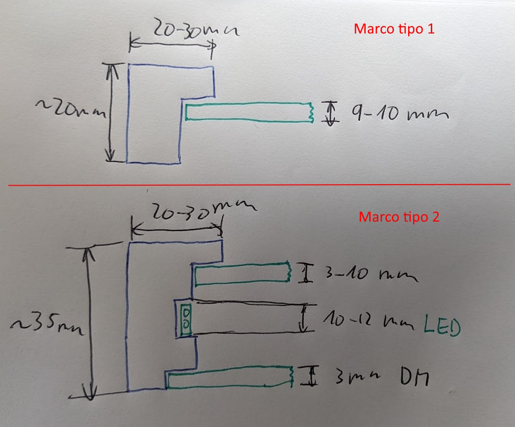 Marcos de madera. En concreto dos tipos. Uno para poner unas láminas de contrachapado y otro que además lleva una tira LED (y un panel trasero para tapar).