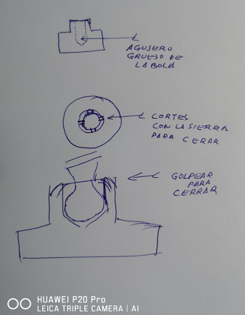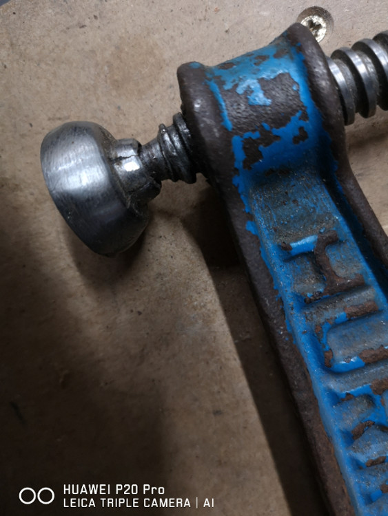 Por lo que veo no es la bola sino el tope que se debe de haber agrandado el alojamiento de la bola,si te fijas donde encaja la bola tiene la profundidad suficiente para esta y queda un sobrante que hay que cerrarlo sobre ellla,encaja la bola y aprieta el sargento en el banco,que te quede la rosca hacia arriba y con un cortafrios sin filo o alfun util parecido ves cerrando a base de golpes la pieza donde encaja la bola.