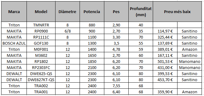 Actualmente quiero una fresadora más potente y he hecho la siguiente tabla comparativa con las principales marcas ordenadas por potencia y quitando marcas que se escapan del presupuesto como Festool i Mafell.
