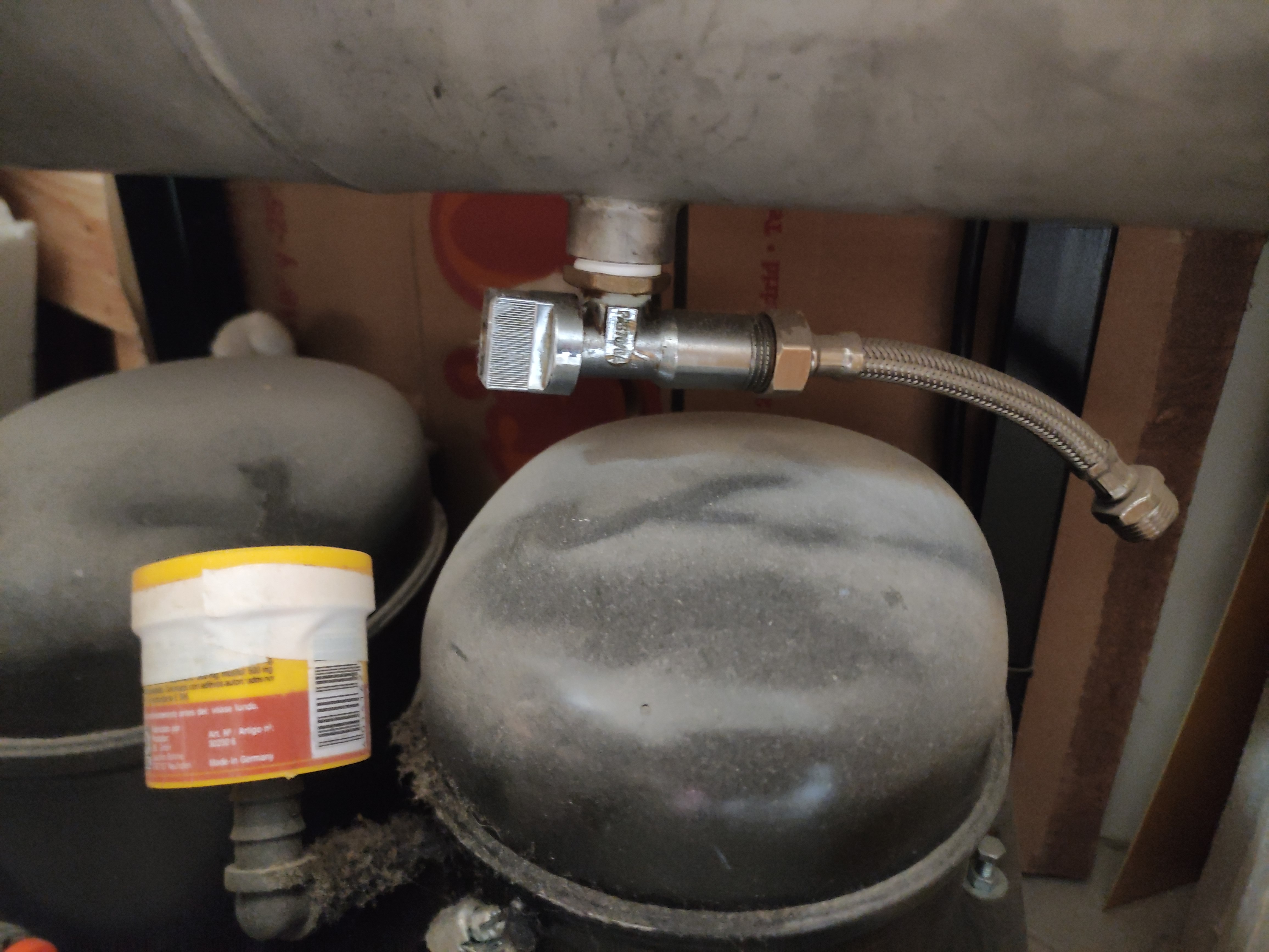 El problema es que en el tubo, cuando el compresor corta, se mantiene la misma presión que tengas regulada para el depósito y cuando el motor arranca, tiene que hacer fuerza contra esa presión, lo que le quita vida. Hay una parte, no recuerdo dónde, puse un tubo de plásticos cerrado con una brida y con un mini agujero que hice con la punta de un alfiler, eso no afecta a llenar el depósito y en cambio le da tiempo antes de arrancar de nuevo a perder la presión.