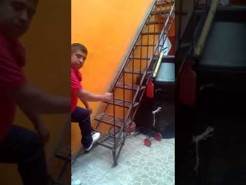 Dejare como 2 o 3 kilos de menos en el contrapeso, para que la escalera desplegada no suba sola y se encage sola en una especie de estantería inclinada como el peldaño, fijada con barilla de min 12 mm sellada con cemento rápido.