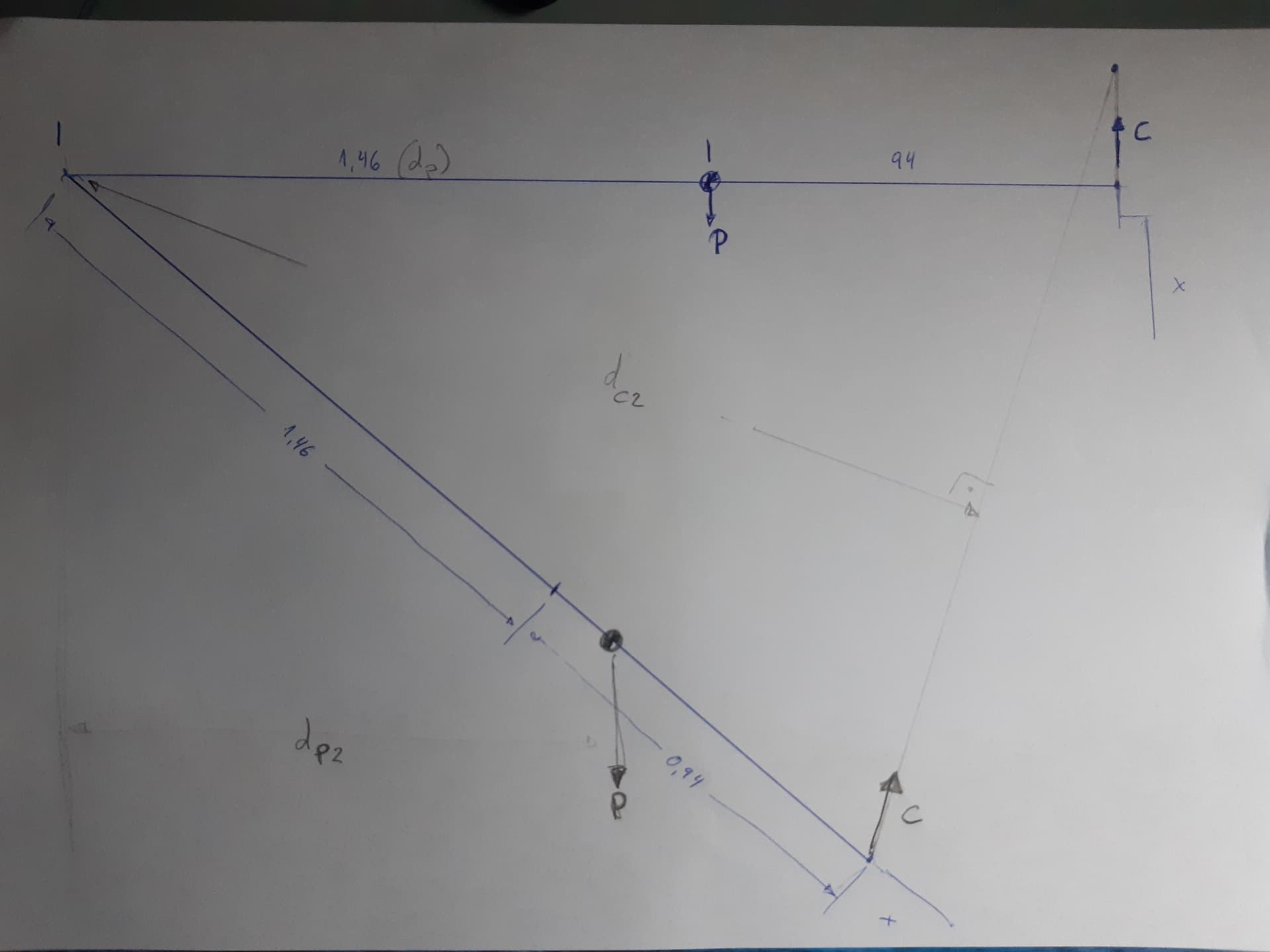Como la distancia que hay que considerar es la perpendicular al vector, te puede cambiar un poco los cálculos. Habría que ver qué distancia hay en horizontal hasta el centro de gravedad con la escalera desplegada (dp2, se puede calcular sabiendo el ángulo) y la distancia mínima del cable a la bisagra (dc2), y ahí la misma fórmula: