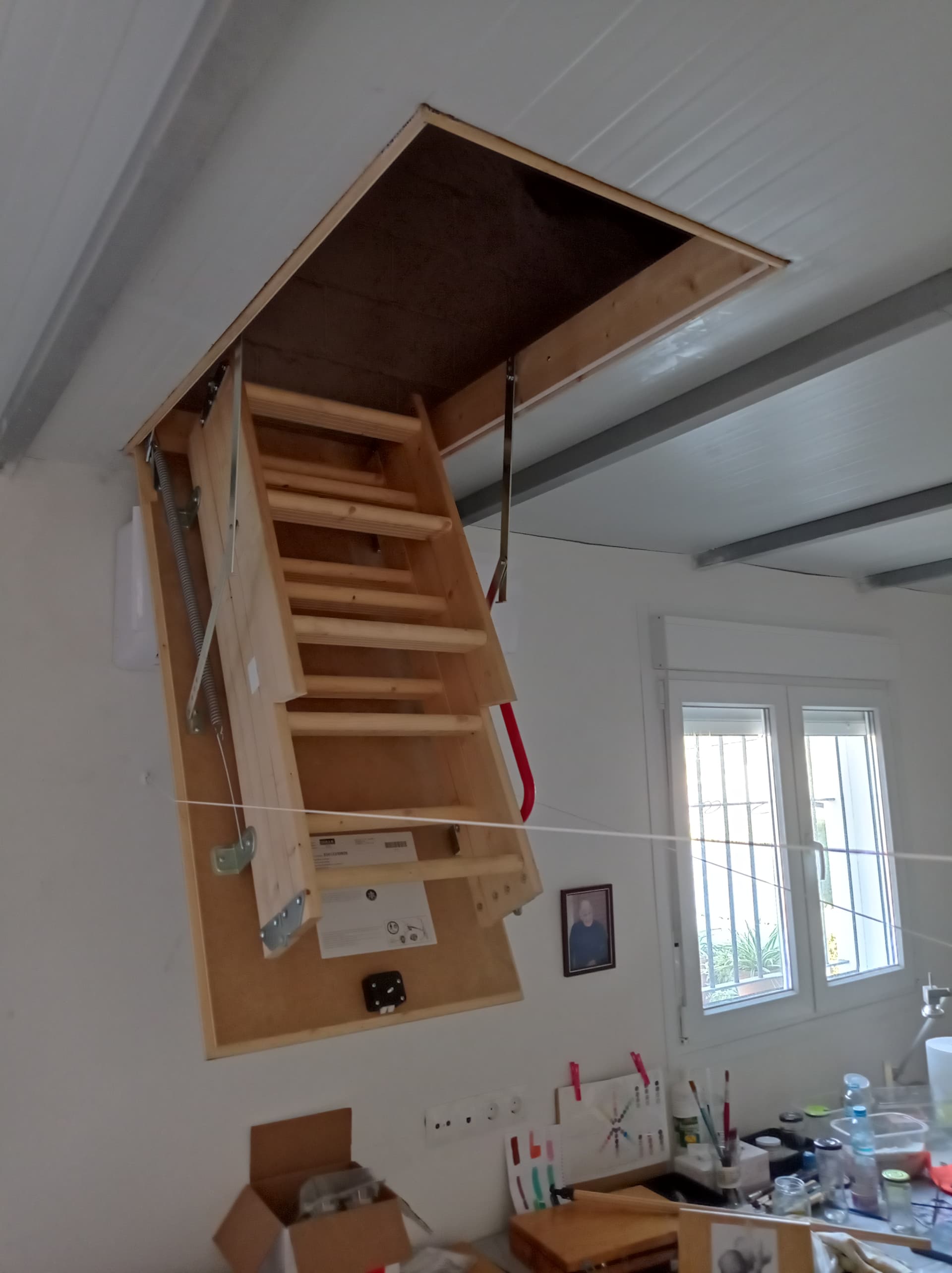 De todos los sistemas el contrapesado mas seguro es pivotando el centro de gravedad de la escalera en el caso de chuf. Asi funciona la escalera escamoteable del desvan de mi casa.
