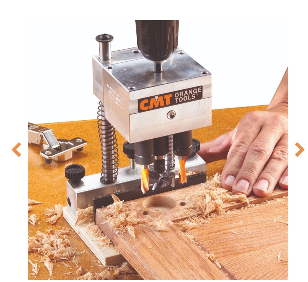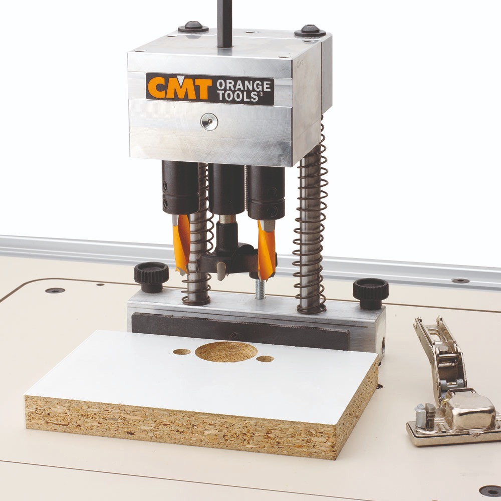 Con el accesorio de CMT y una mortajadoras de formon barata de los chinos como taladro,prepare una bisagradora para un amigo que hace algunos muebles en melamina ,además trajo de Italia un accesorio también de CMT que hace cinco agujeros a la vez, quedó las en u las mortajadoras son más rijodas que los taladros baratos, leva dos columnas ,lo único que no gusta es el sistema de con amortiguador de gas en vez de muelle,