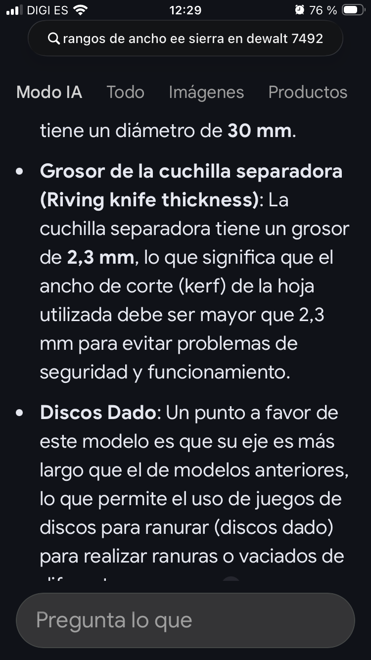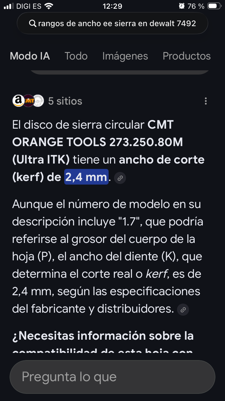 Refloto este tema de discos de la 7492 porque estoy haciendo un armario en aglomerado con melamina y el disco que tengo, el original, la rompe demasiado. Se habla de las geometrías ATB o TGC y mínimo 80, dientes, pero mirando me encuentro con alguna pega como el grosor, además de que si es muy fino, según he leído, puede tener problemas de vibraciones, no creo que valga por el grosor de la cuchilla de separación (no puede ser mas gruesa que el propio disco creo yo), los que he y pongo enlace son un poco más gruesos, el original creo que son 2,3mm, que no se si es un problema para la maquina, vosotros diréis.
