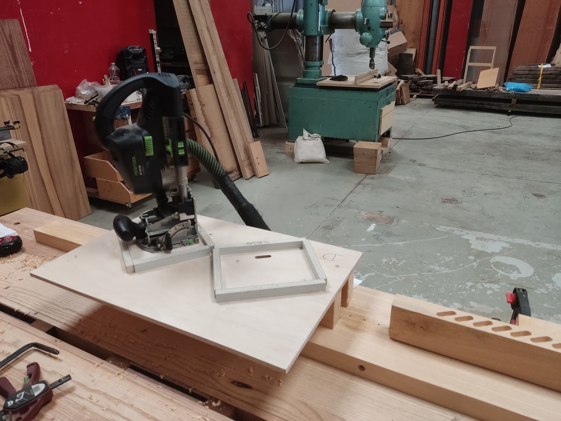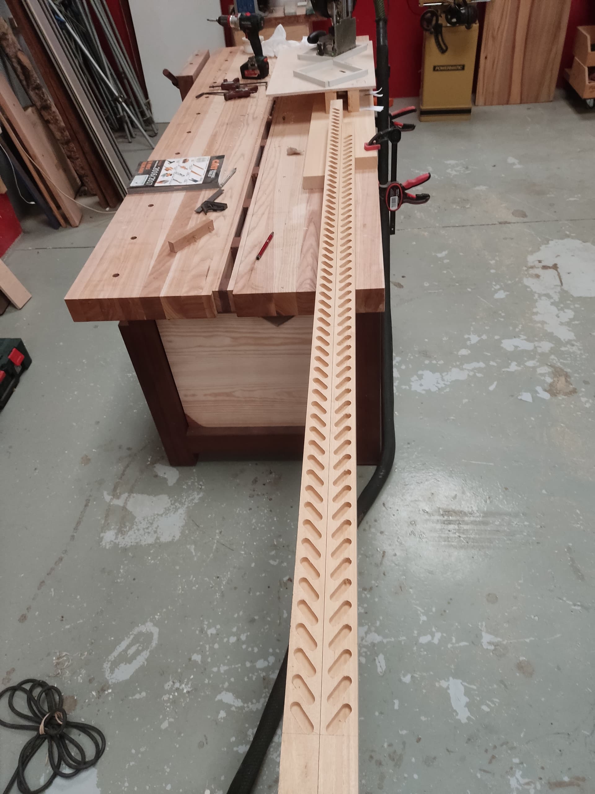 Le realice una base de contrachapado a la dominó, ya que su base no permite acoplarlo con precision. Le puse cinta de doble cara y en base a esa plantilla hacer topes en los listones. La verdad que increíblemente me salió a la primera, entre las 2 bases había una diferencia de 8,05mm que solucione poniendo un canto de 8mm en un lateral, los 0,05mm me parecieron muy aceptables. Luego sobre la plantilla agujeros cada 3,2cm y un tope con 2 hierros que encajaban en el primer y tercer agujero, para que no se desgastase tan pronto. Después de haber realizado 2670 taladros, el agujero de métrica 3 paso a 3,15mm pero como esas holguras se han repetido y no acumulado a salido muy bien. Si tuviera que hacer más realizaré la base de agujeros en una pletina de hierro, pero está a cumplido con creces