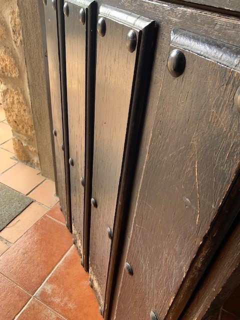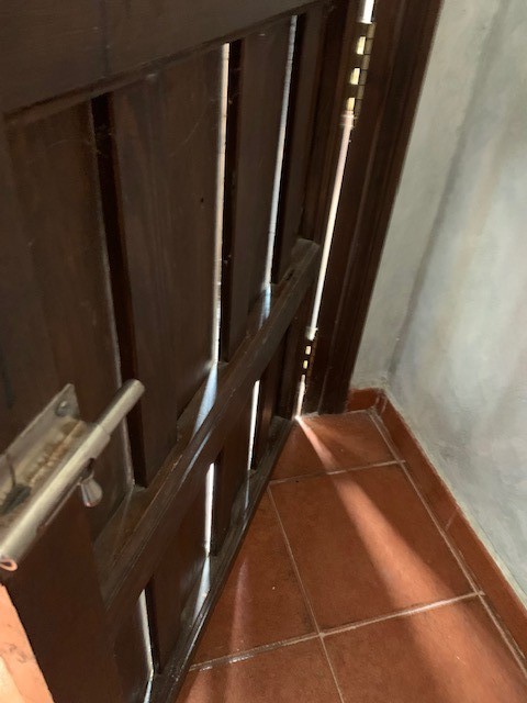 Esta puerta esta constituida de un bastidor,que parece en buenas condiciones, sobre el cual se calvo o se atornillo 4 tablas.