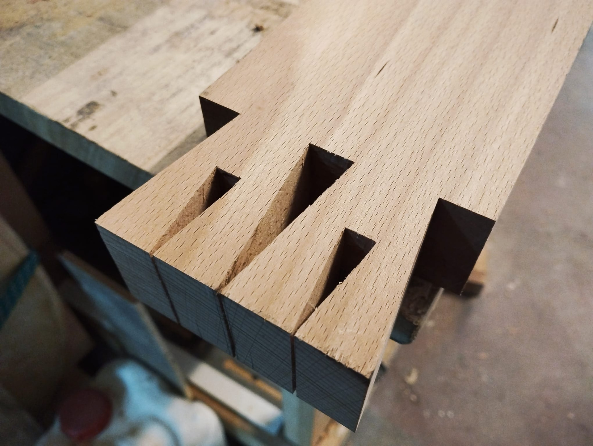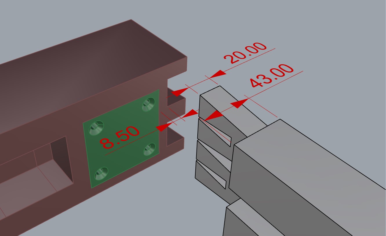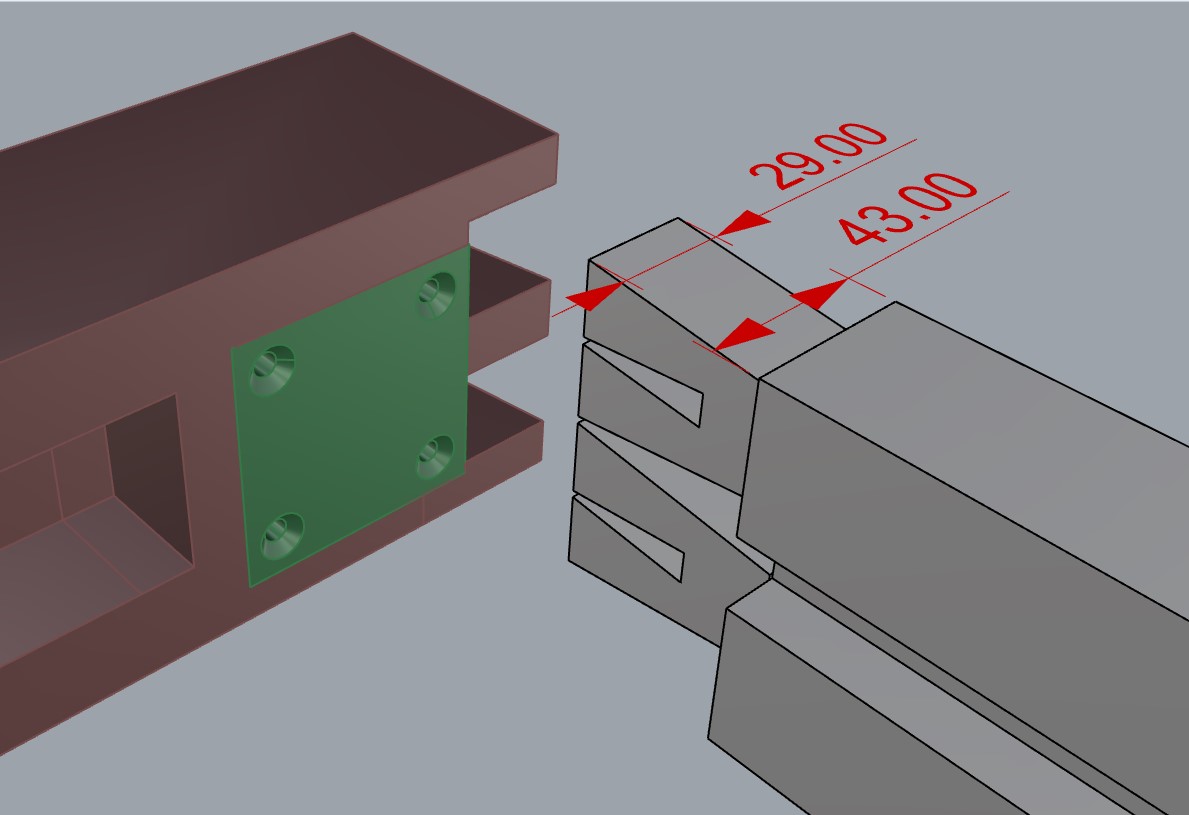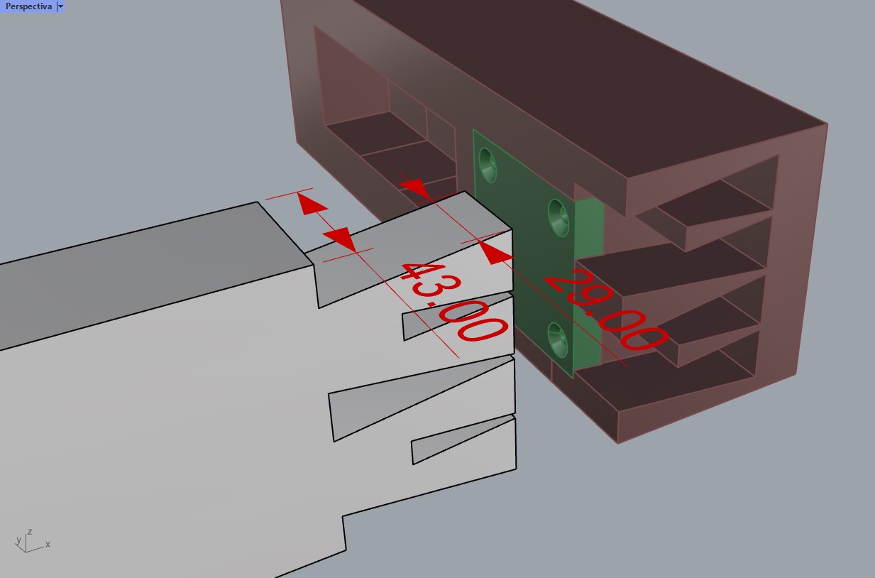 Por fin he podido volver a ponerme con el banco de trabajo, pero tengo una duda sobre cómo proceder ahora. Ya he hecho las colas de milano en el tablón final, pero aún necesito hacer el vaciado donde encaja en el taco del extremo. El grosor del tablón es mayor que la distancia que tengo hasta el borde de la pieza de la rosca del husillo, así que necesito reducir el grosor de la cola de milano. Tengo dos opciones. La primera es darle el máximo grosor permitido hasta que llegue a la rosca (29 mm); la segunda es dejar un margen para que la rosca tenga una pared (pared de 8,5 mm, grosor de la cola de milano de 20 mm). ¿Qué opción debería elegir?