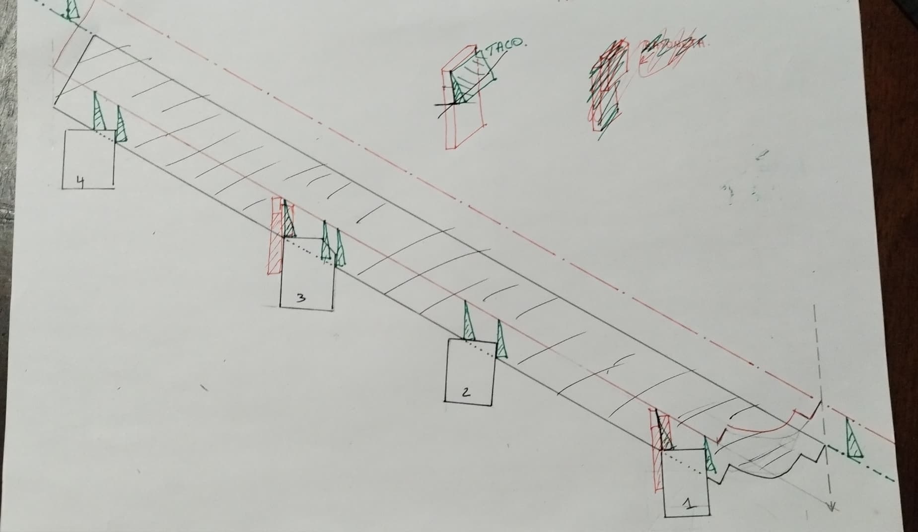 Realmente lo importante es la línea superior (linea deseada), la pongo en dos palos VERTICALES (que no dibuje), es verde en el plano.