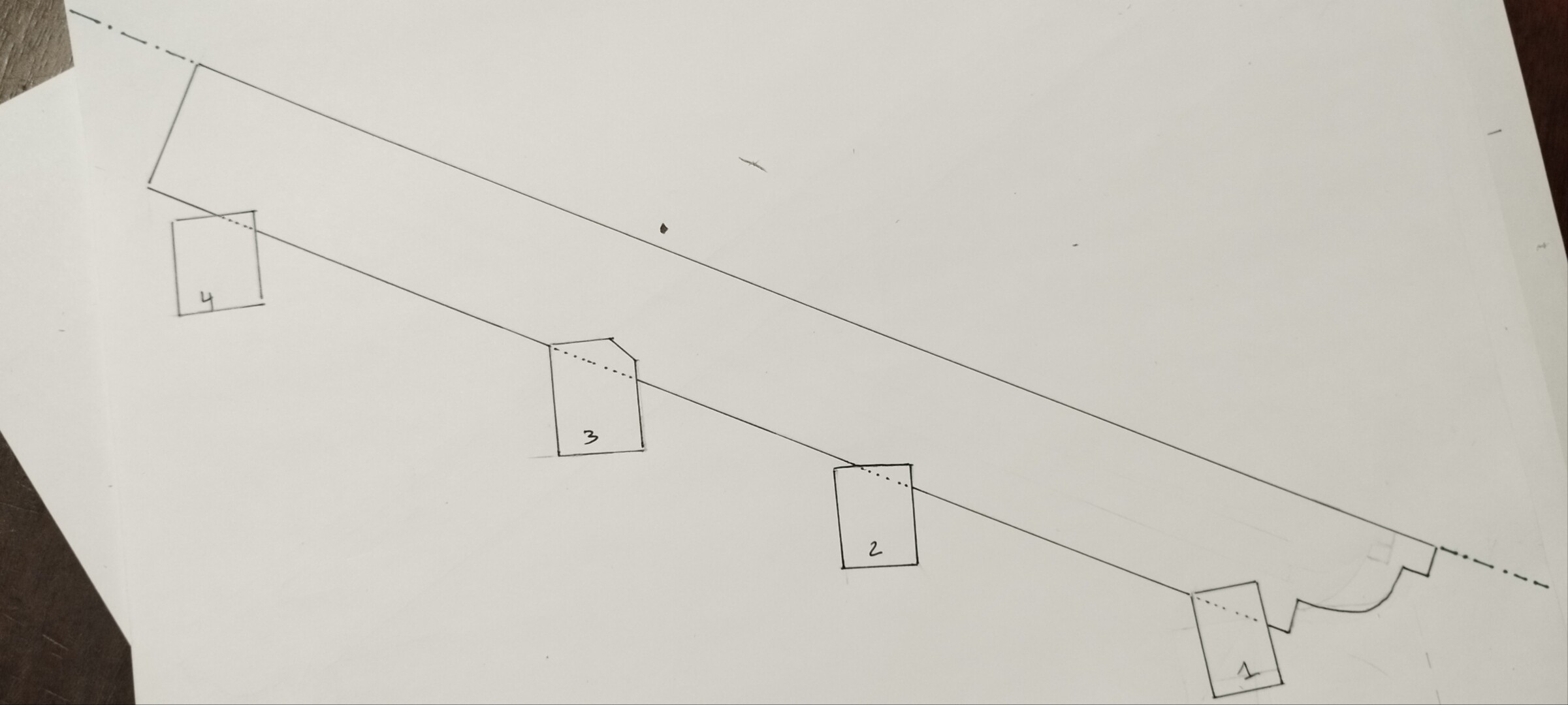 Pero si quisiera hacerlo en la viga lo haría posando el taco sobre el travesaño y marcando la viga como lo dibujo @icalero , buscando siempre los ángulos (como en el 3)con la plomada.