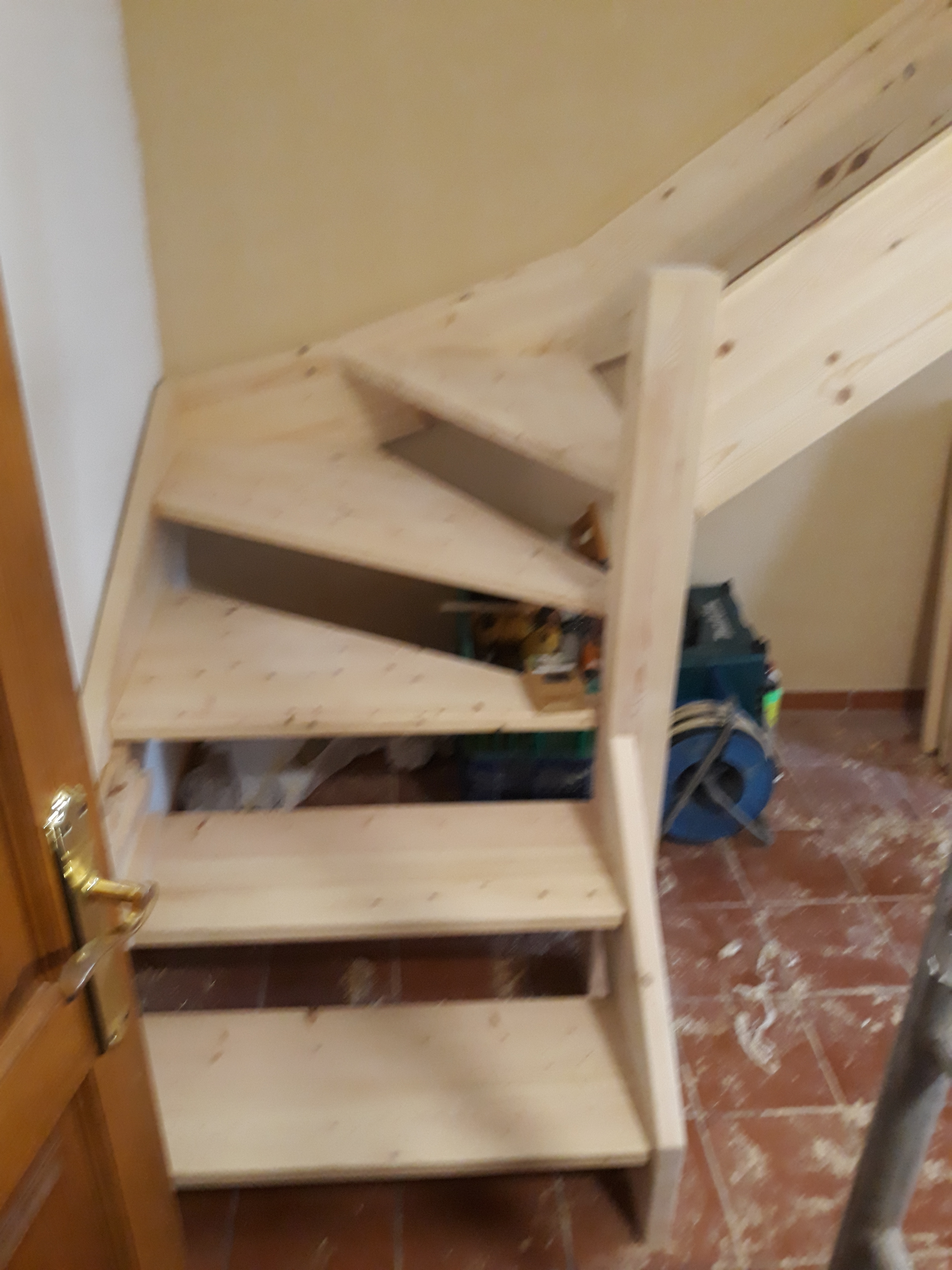 A mi el flandes no me desagrada…para mi es una madera muy agradecida…lo que no me acaba de convencer son las escuadras…estas escuadritas individuales con dos tornillos para una escalera no me gustan,si con el trajin se afloja algun tornillo la escuadra queda floja,si fuera un perfil largo como el ancho del escalon con varios torniillos es mas dificil que el escalon con el tiempo de mueva.