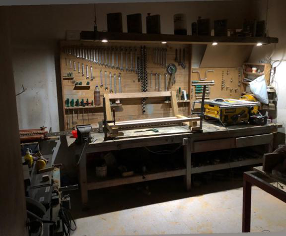 Tengo una garlopa/cepilladora, sierra circular de mesa DeWalt, una agujereadora de banco grande, una lijadora de banda pequeña, un compresor grande y un tupí con eje de 40mm que aún no está en funcionamiento, pero es un proyecto que tengo por la mitad, tengo, además, herramientas manuales y eléctricas como lijadora rotorbital, una sierra circular de mano, etc-.