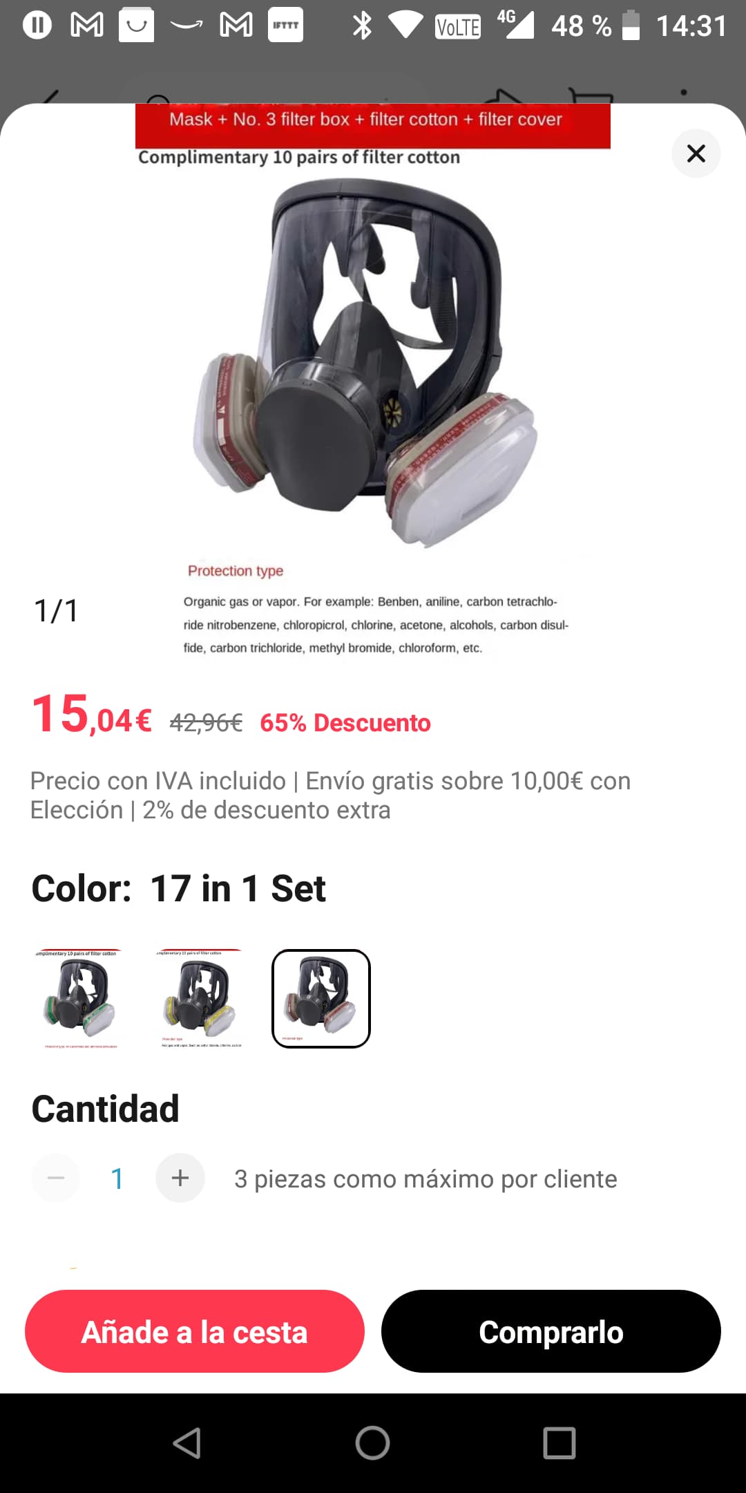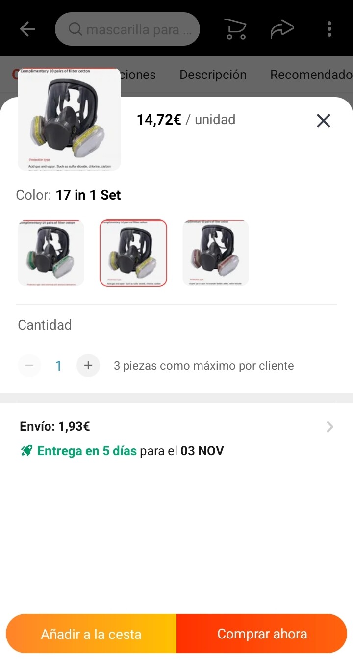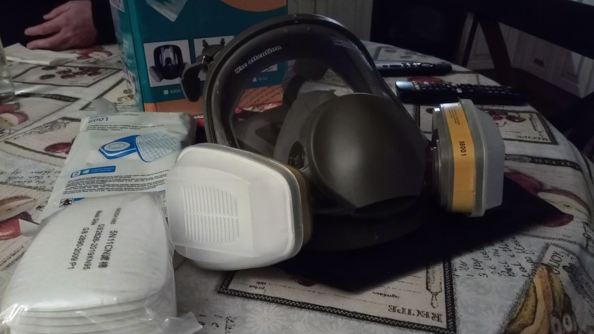 Tiene buena pinta. Sorprendentemente con todos los filtros puestos no molesta nada para respirar. Me la he puesto durante cinco minutos y no parece que se empañe. Tiene buena visión hacia la zona de trabajo.