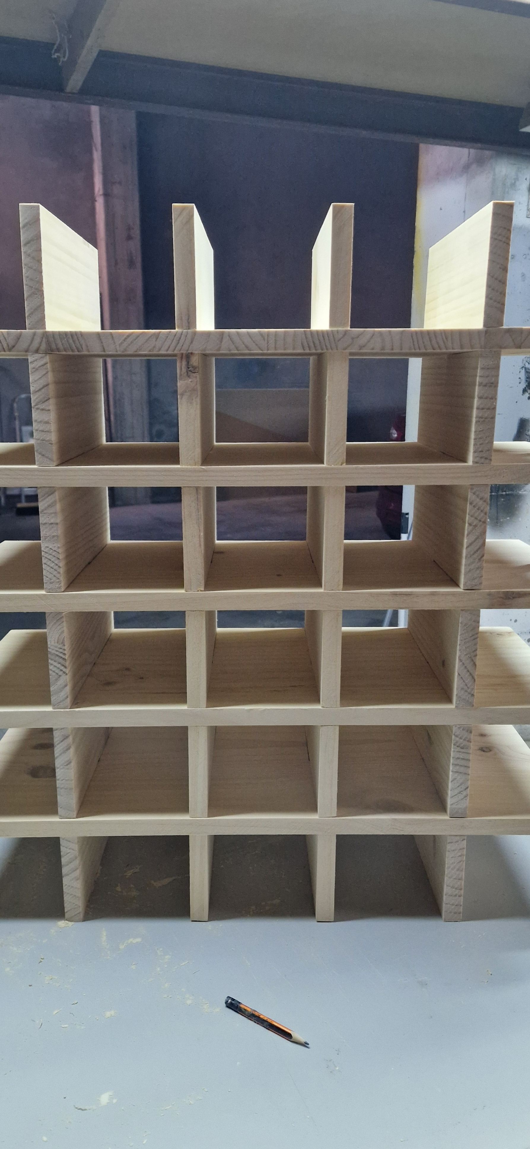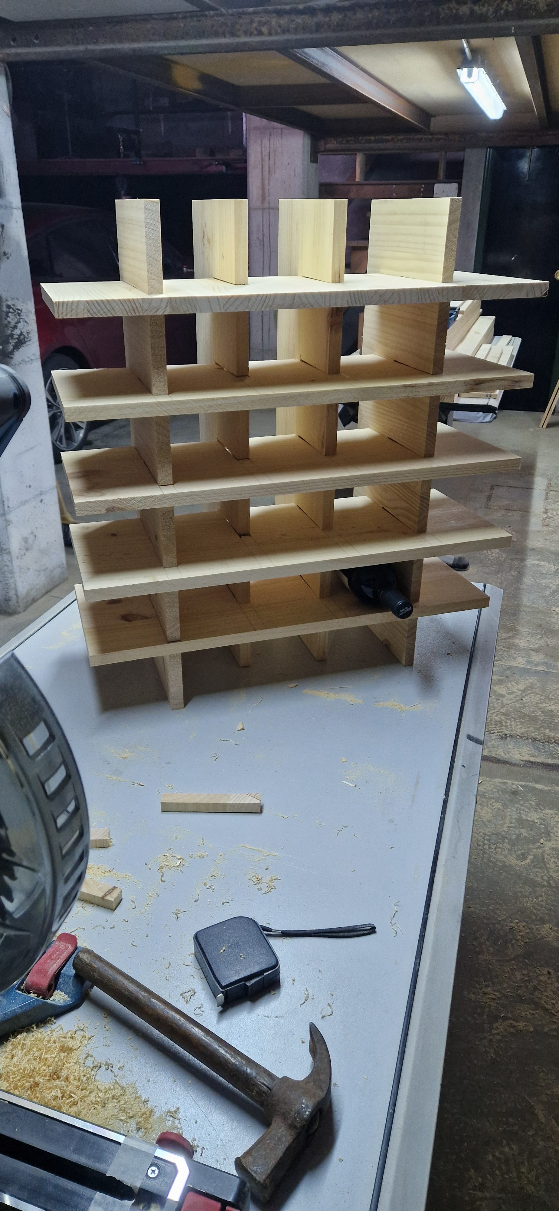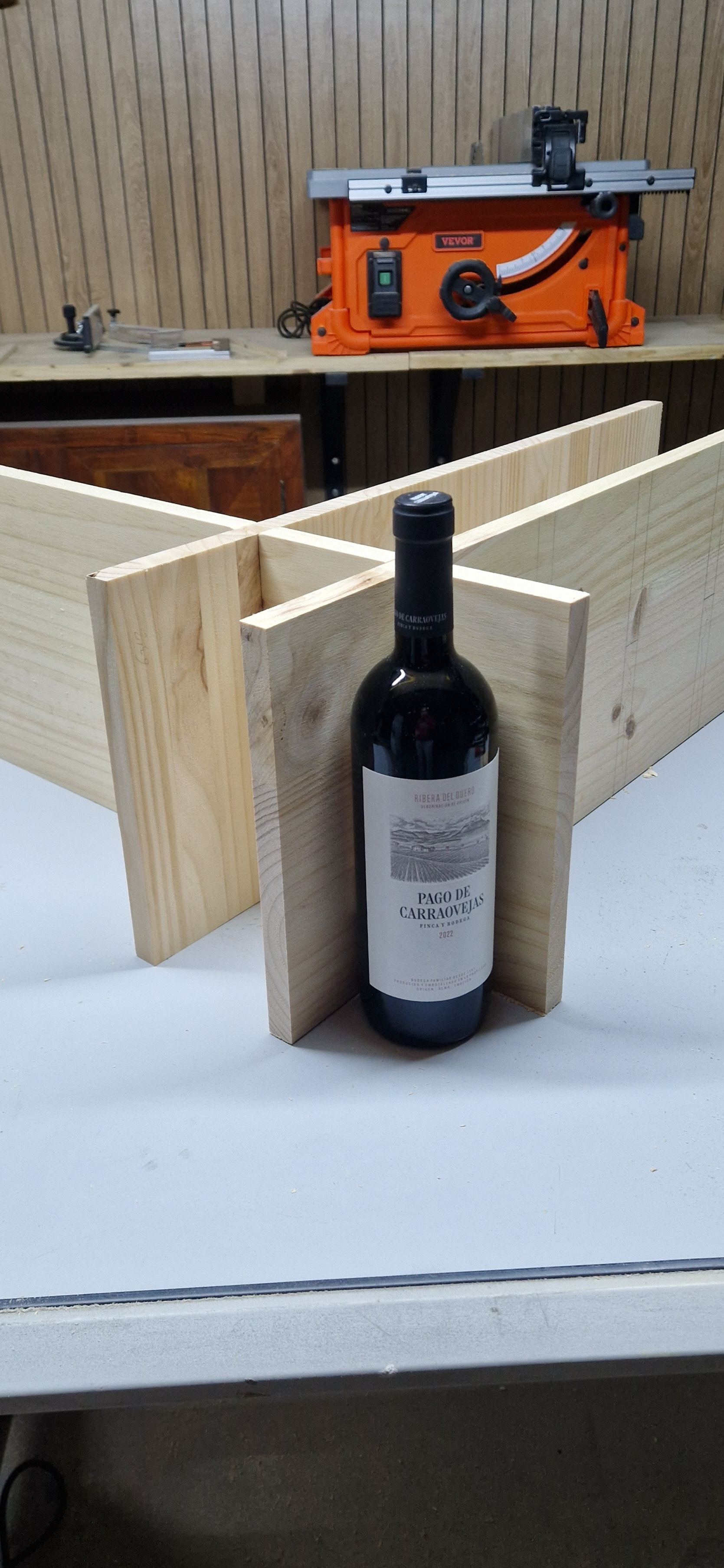 Al botellero a parte de hacer ese encaje a media madera yo le haria un fresado de unos 3 mm de profundidad para que la madera quedase sujeta en su totalidad.