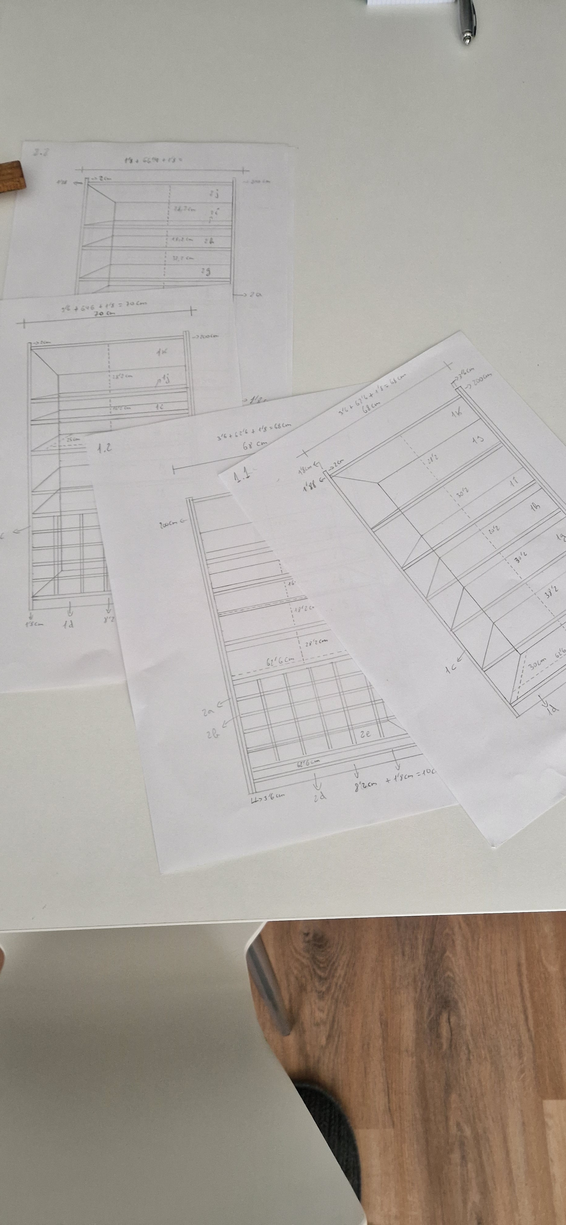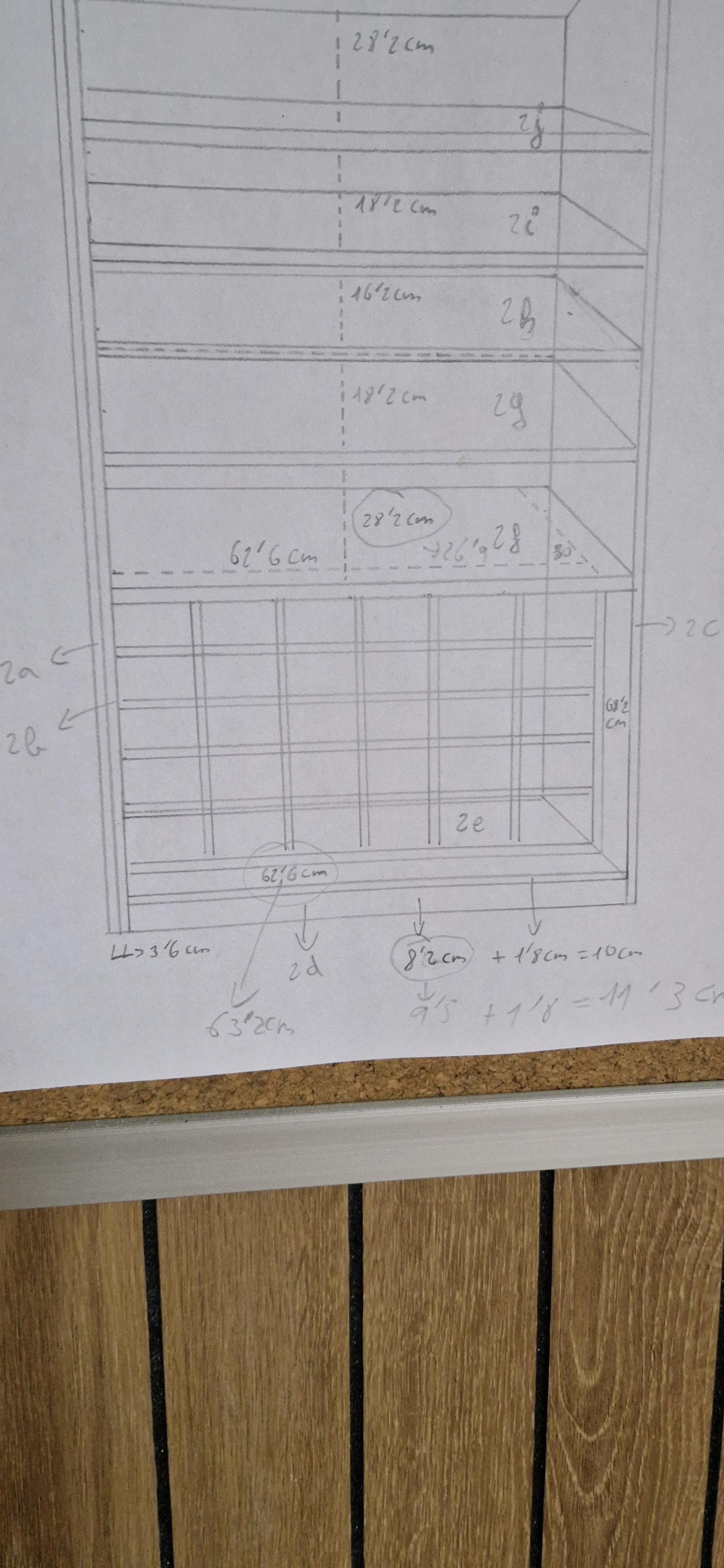 Por otro lado, si, tengo en cuenta lo que comentas del grosor de los tableros de los costados. Este es solo un primer boceto para calcular mas o menos cuanta madera necesito, ahora haré estanteria a estanteria con las medidas exactas de todo.