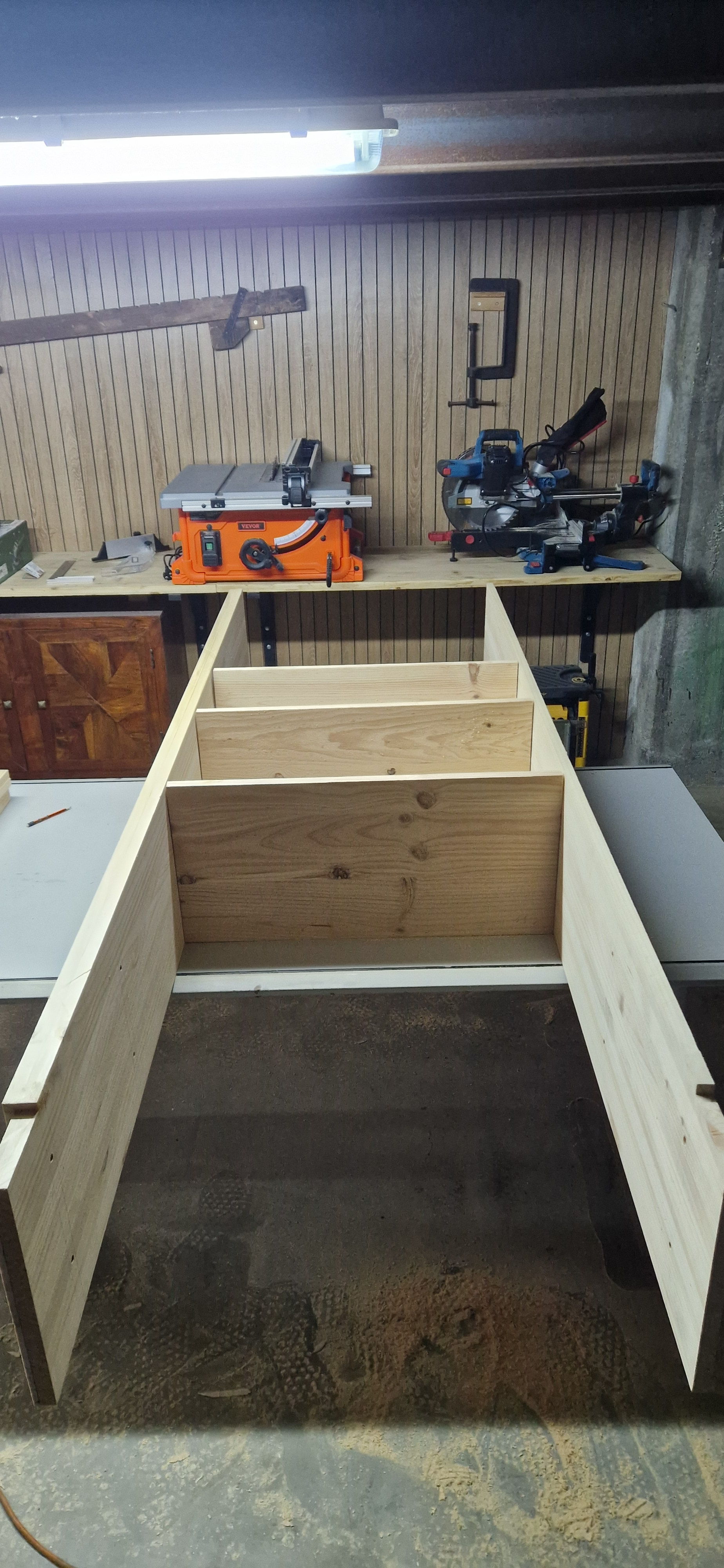 No haría modulos, sino un estante de pared a pared…porque doblar montantes?