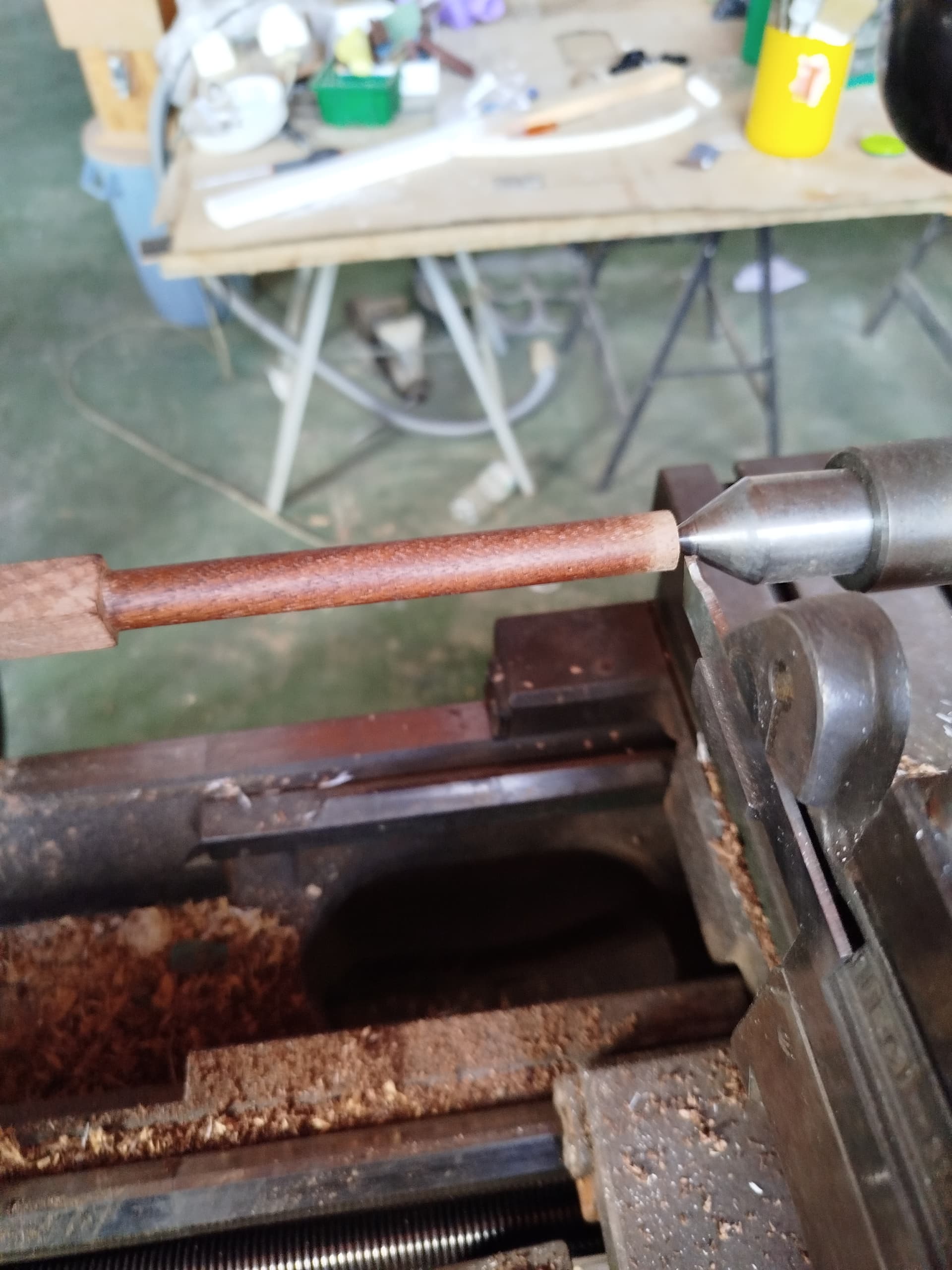 He hecho una prueba con encina y nogal, este ultimo con una capa de aceite de linaza, la cuchilla la que estaba puesta, de tronzar, …algo de lija…y el cilindro perfecto. El retal de nogal de siglo XIX.