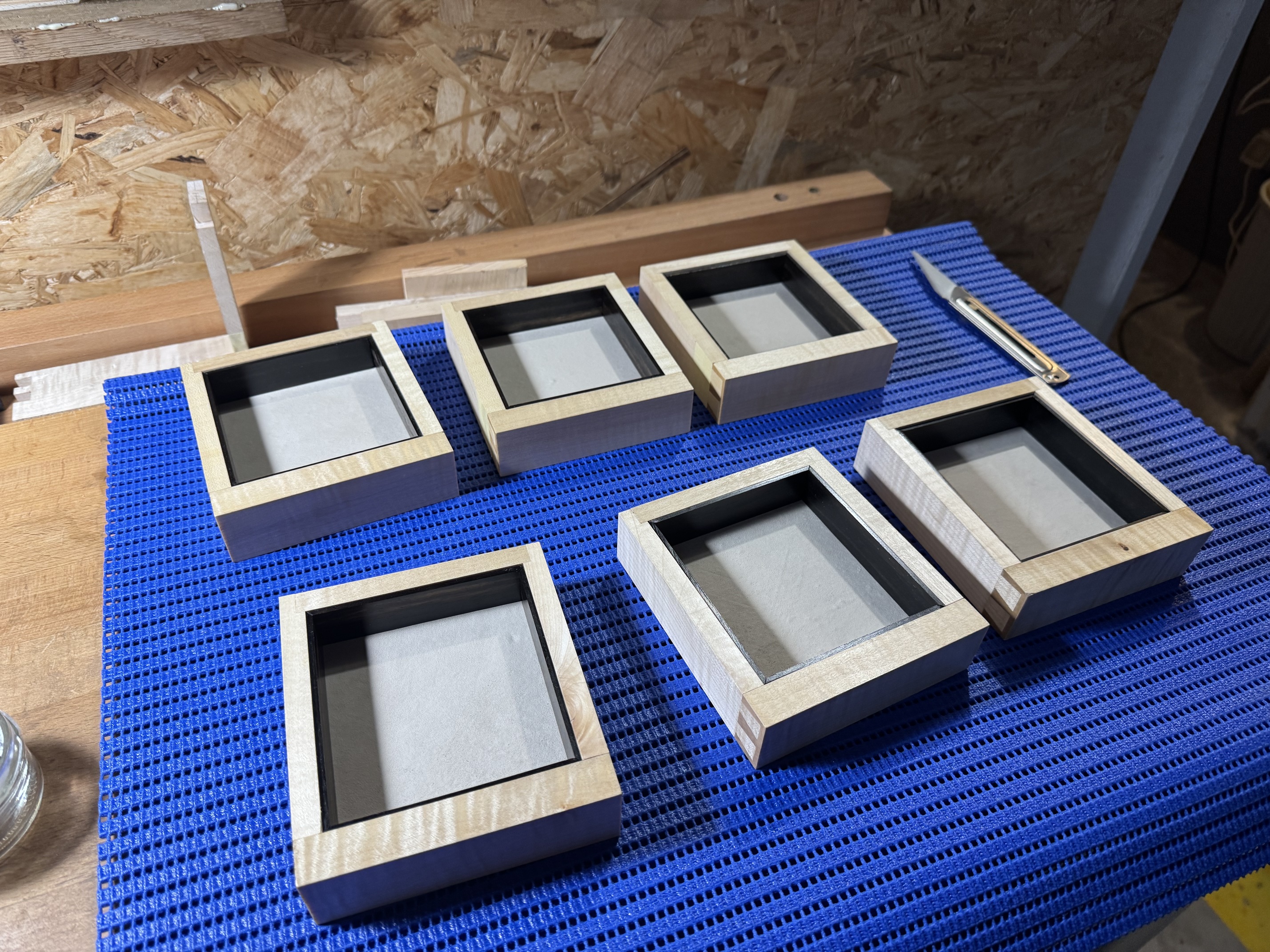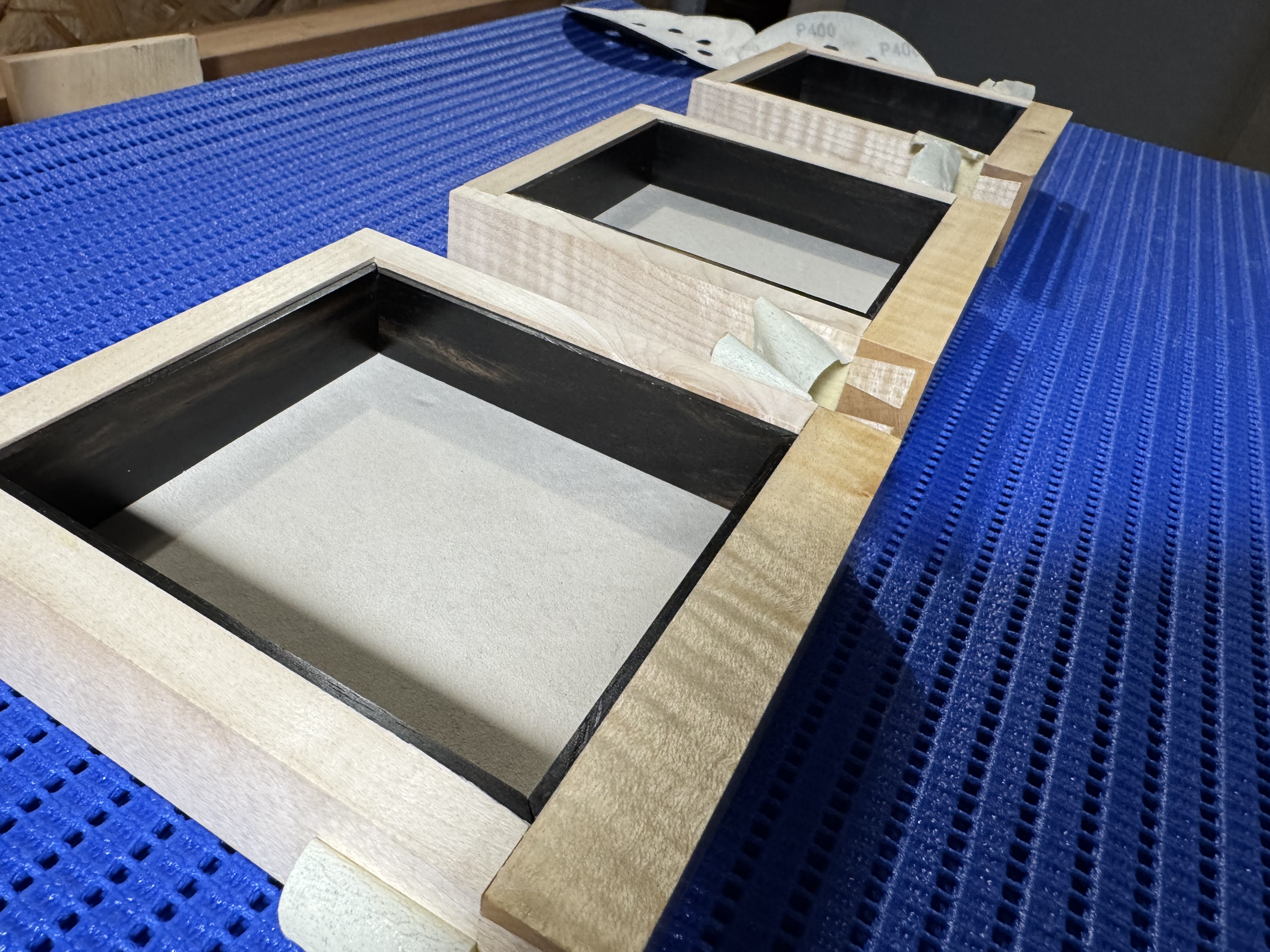 Los fondos van forrados con piel de ante sobre una lámina de corcho de 1 milímetro. Ahora estoy con los acabados. Estoy usando goma laca para los frontales, interiores de ébano, colas de milano y partes superiores. El resto de los cajones irá con cera.