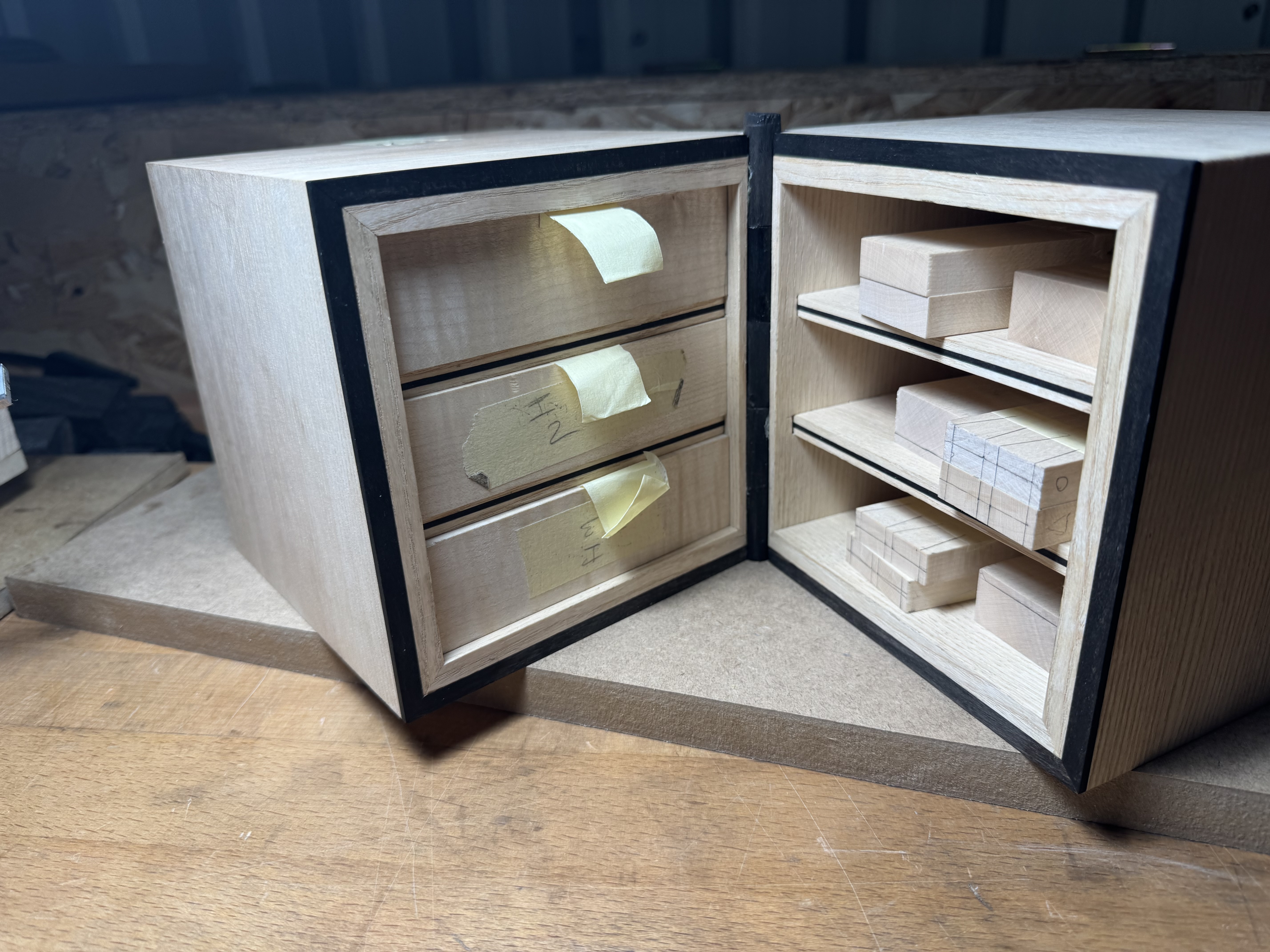 Cajones terminados. Queda ajustarlos a cepillo y los interiores. El fondo irá en ante sobre una fina lámina de 1 mm de corcho.