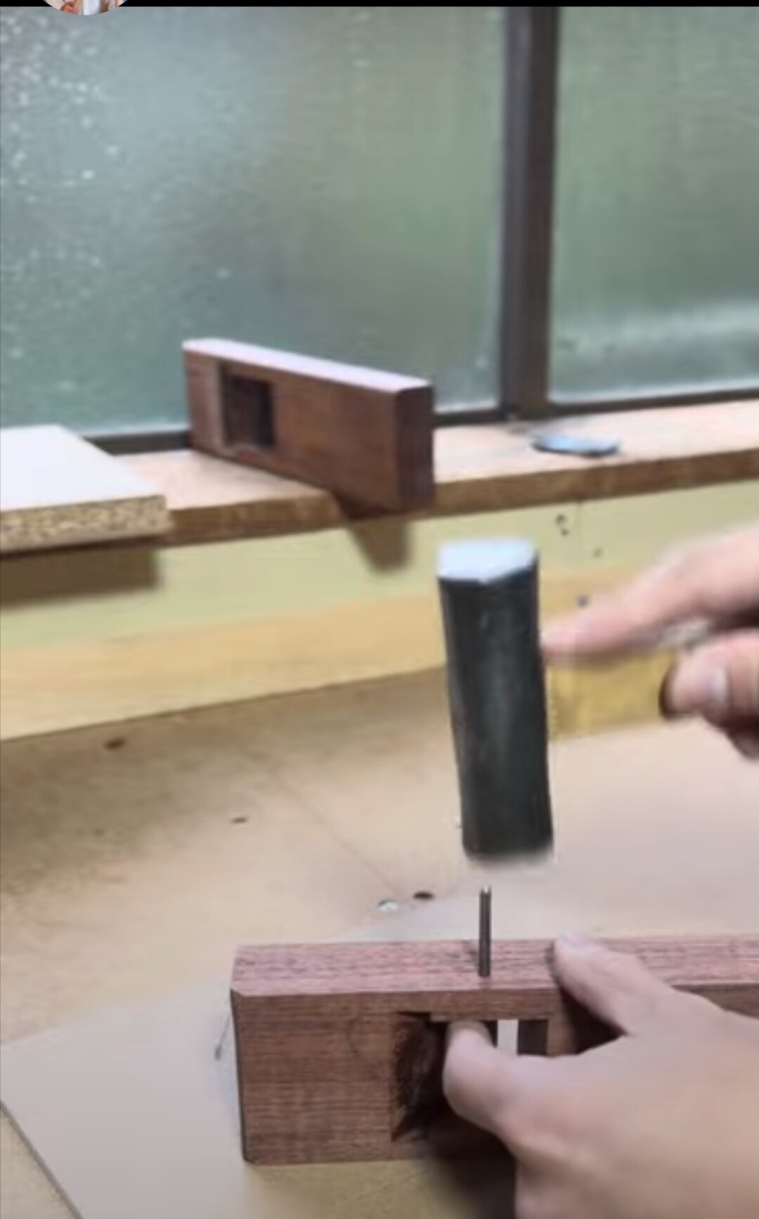 Aumenta la imagen. Cuando martillea el pasador se le agrieta la madera, crashhhh. Pone la mano encima para tapar. Cambia el plano y ya no está. Tramposo.