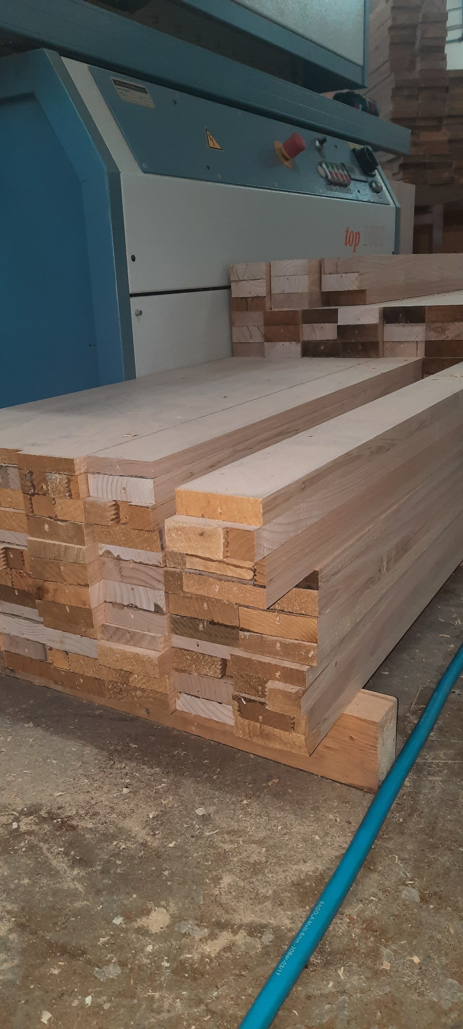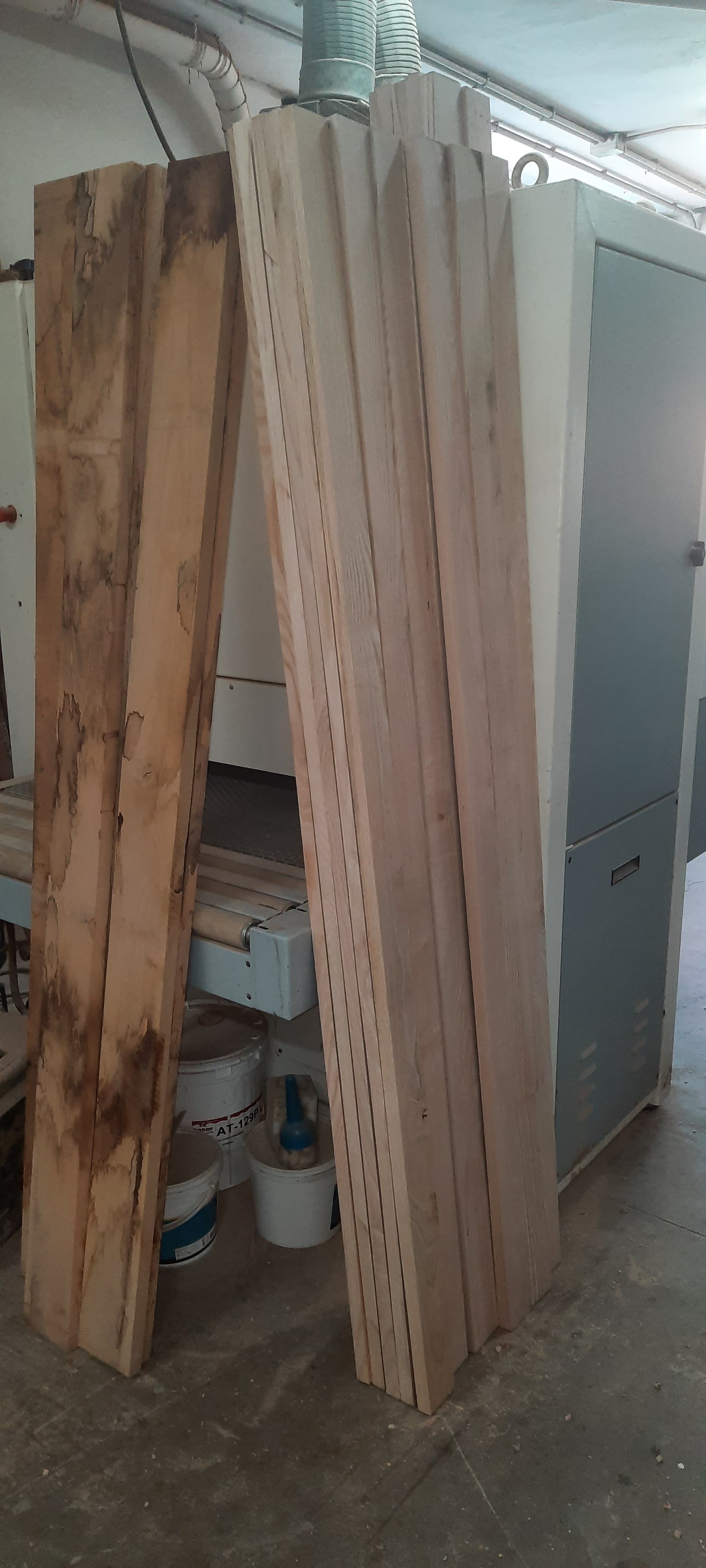 Comenzamos por deshilar las tablas de castaño a la medida de ancho deseada. En nuestro caso marcos de 70x80 (4 capas de 75x21) y hojas de 85x70 (3 capas de 90x24). Verificamos que la madera esta entre 6 y 8% de humedad.