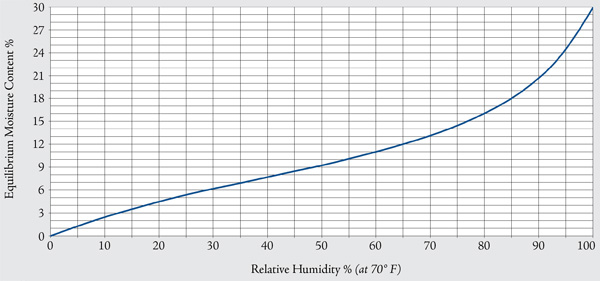 La relación entre humedad relativa en el aire y humedad en la madera varía un poco con cada especie, pero a 21C es generalmente así: