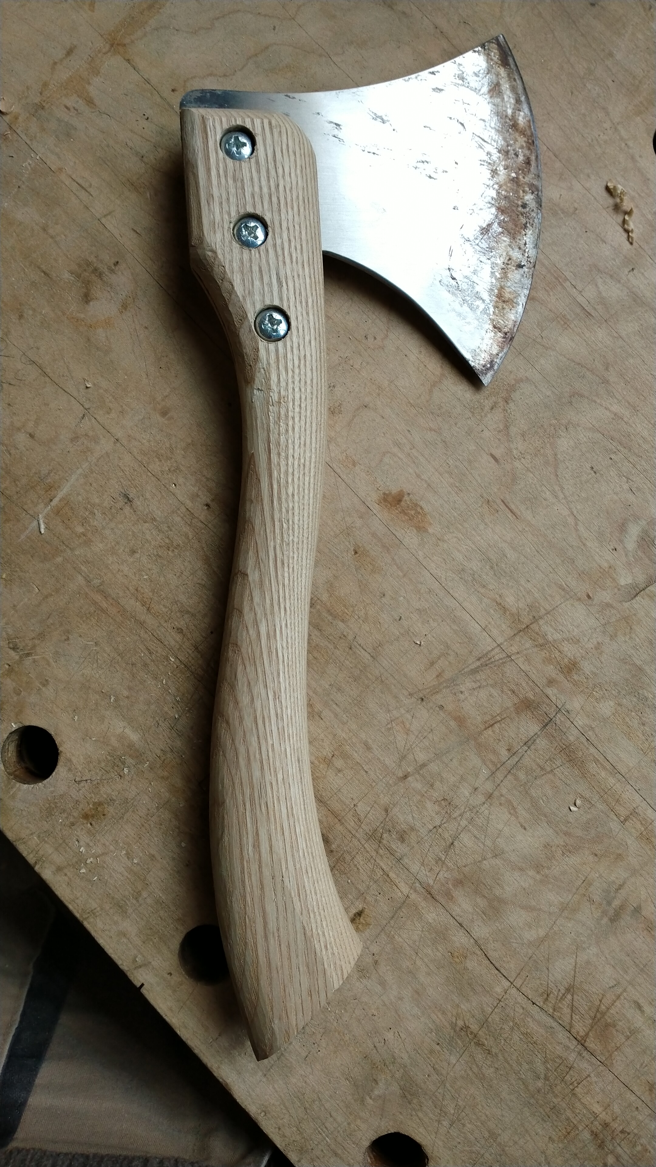 Hace un año, pasaba por mi puerta del taller, mi cliente con quién he hecho unos cuantos trabajillos en su casa. Esta vez me presentó una hacha con mango de aluminio que ha roto. En serio? Un mango de una hacha hecho por una fábrica EN ALUMINIO?? Material completamente inútil para esta herramienta. Le dije mi precio, 45€ para hacer uno en fresno, muy conocido por su característica de absorción de choques. Por eso motivo fue la madera más usado para la fabricación de raquetas de tenis, de hockey, etc.